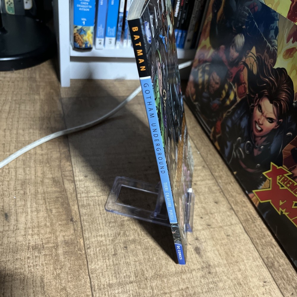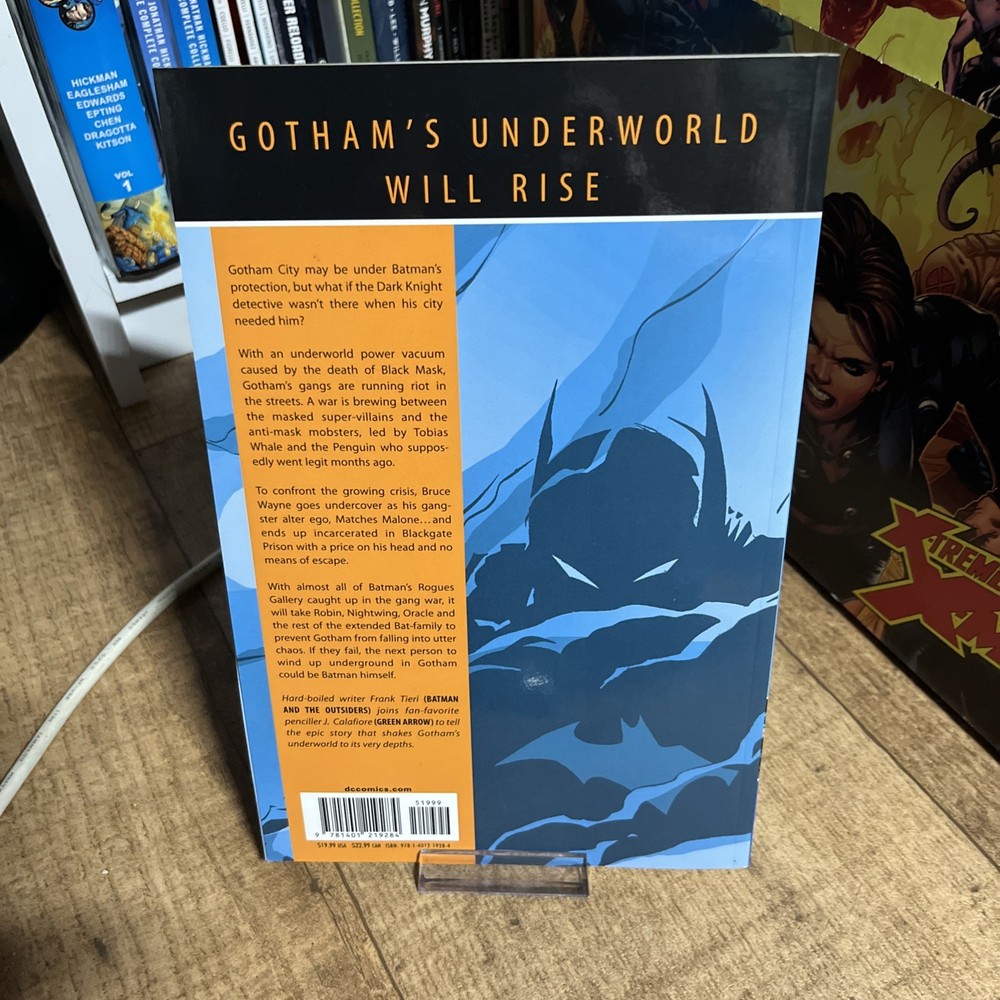 The "DC: Batman Gotham Underground" graphic novel, published in 2008 by DC Comics, features classic characters like Batman, Alfred Pennyworth, the Penguin, Scarecrow, and Nightwing. With a colourful style and a first printing, this trade paperback is part of the Batman series set in the DC Universe. Written by Frank Tieri and with artwork by J. Calafiore, this modern age superhero genre novel is perfect for general audiences interested in the iconic superhero team in the Gotham Underground.