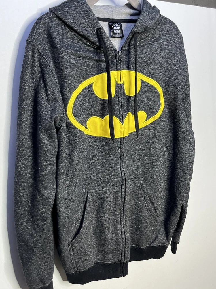Batman hoodie jacket Men’s L Gray patch yello embroidered kangaroo pockets logo Full Zip Hoodie Good pre owned condition, little to no signs of wear. Measurements are in the photos. I discount shipping for multi item purchases. Thank you for supporting my small business.