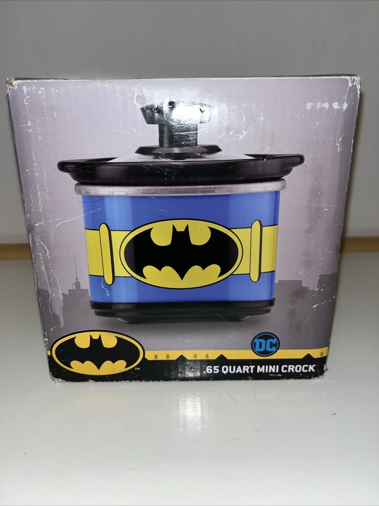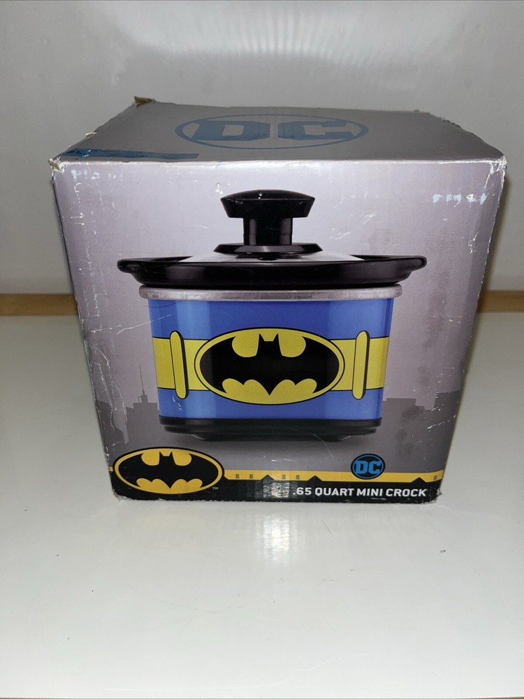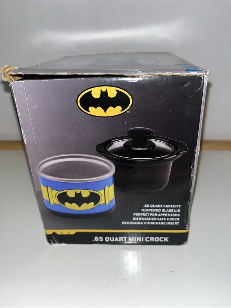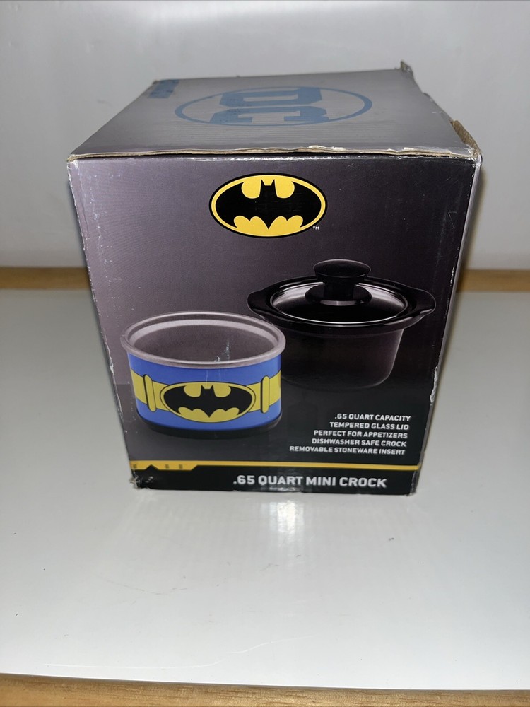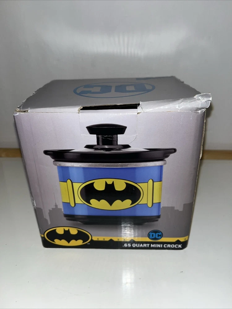This Batman mini crock pot is so cool—perfect for small meals, dips, or keeping snacks warm! The .65-quart size is great for personal use, and the glass lid makes it easy to check your food. The stone crock heats evenly, and the DC Comics design is a fun touch for fans. The box has a slight crease, but the cooker itself is brand new and works perfectly. Super handy and stylish!