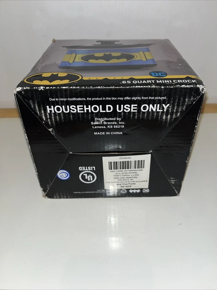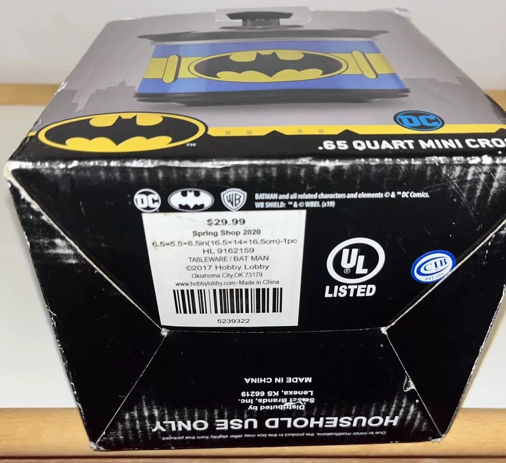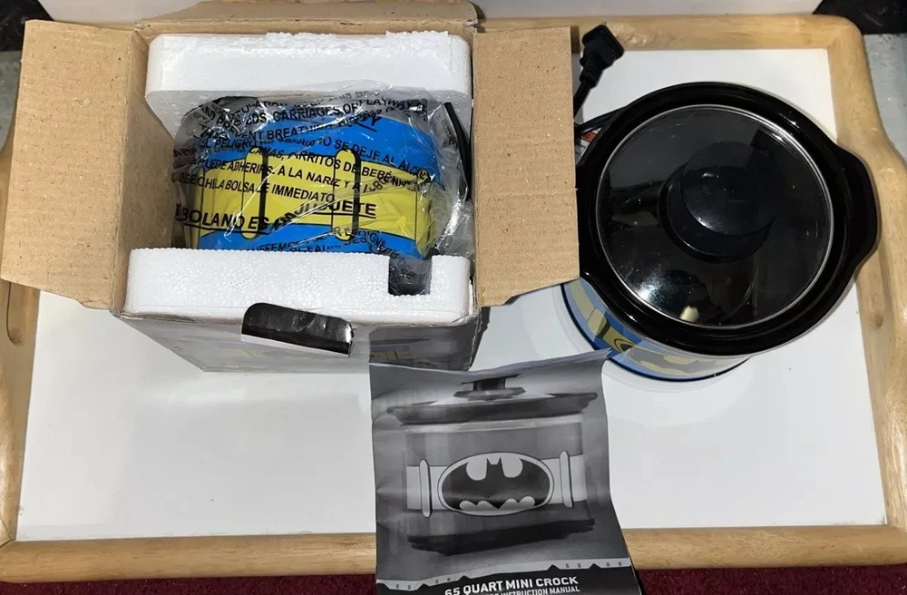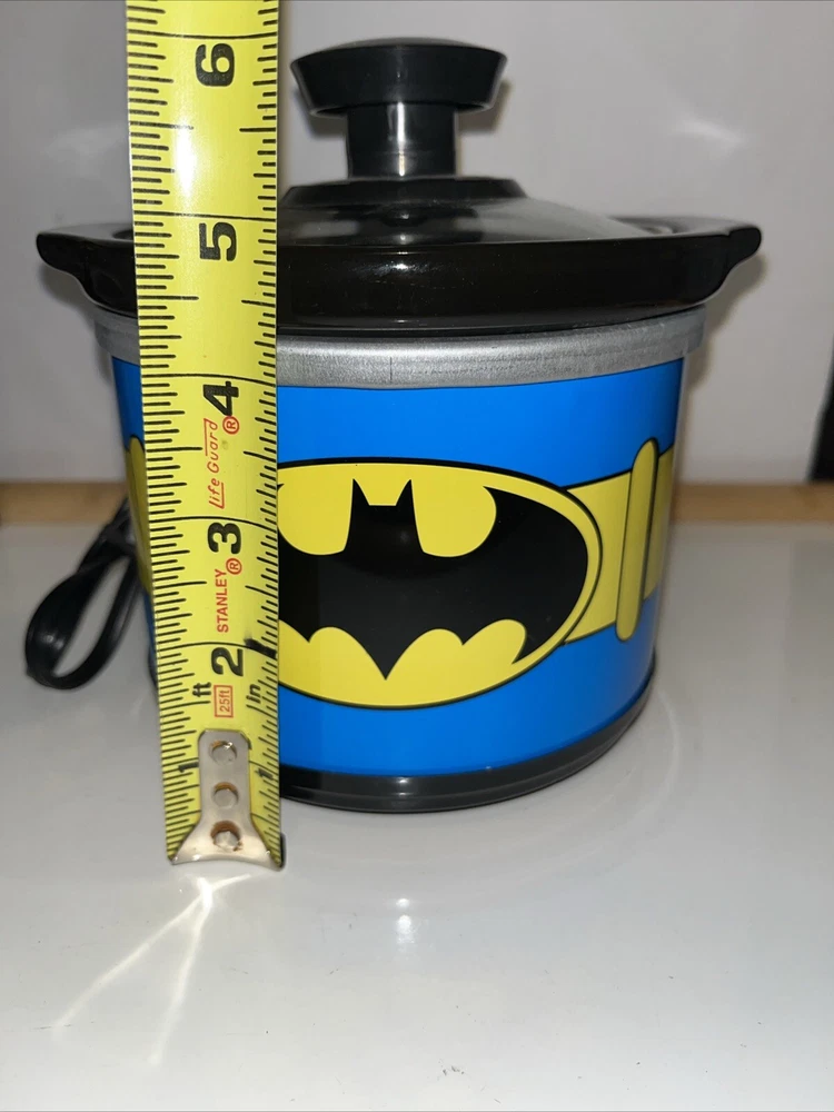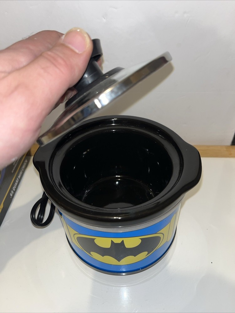 This Batman mini crock pot is so cool—perfect for small meals, dips, or keeping snacks warm! The .65-quart size is great for personal use, and the glass lid makes it easy to check your food. The stone crock heats evenly, and the DC Comics design is a fun touch for fans. The box has a slight crease, but the cooker itself is brand new and works perfectly. Super handy and stylish!
