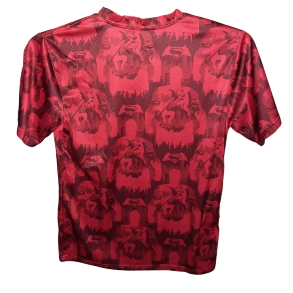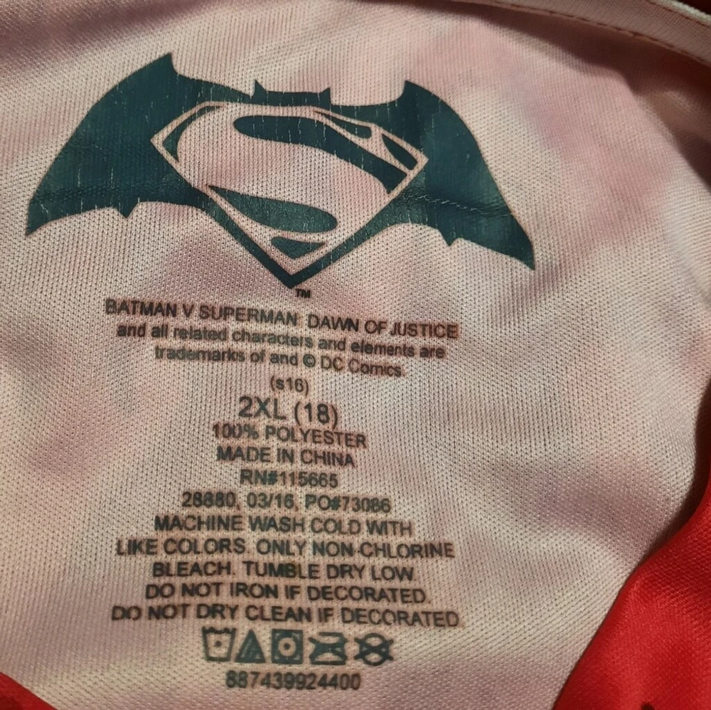 Batman V Superman: Dawn of Justice Boy's Tee Size 2XL (18). The tee is 100% Polyester. Machine washable. Short Sleeves. Multicolored. Graphic Print. Soft. Stretchy. Smooth feeling. The tee shows signs of normal wear. Please see pictures for more details. Colorful. With the garment laying flat, the measurements are as follows: armpit to armpit is 18 inches and from back of the neck to bottom of the tee is 25 inches. Preowned but in good condition.