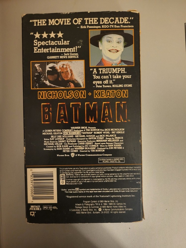 Experience the thrilling adventure of Batman in this classic 1989 VHS movie. Featuring an iconic performance by Michael Keaton as the titular character, this movie is a must-watch for fans of superhero movies. The story follows Batman as he battles against the Joker, played by Jack Nicholson, to save the city of Gotham from his evil plans. This VHS tape is in NTSC format and has a rating of PG-13. It is a full-screen edition and features a compelling storyline filled with action, adventure, thriller, psychological, family, and cult elements. The movie is directed by Tim Burton and is a great addition to any movie collection.