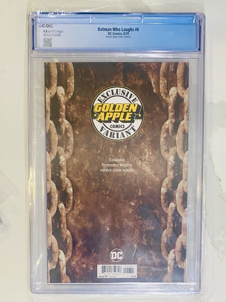 Brand new! See photos for conf and details. The Batman Who Laughs #6 CGC 9.8 Joker Mattina Variant Cover is a highly coveted comic book featuring the characters Batman and the Joker, written by Scott Snyder and with artwork by Francesco Mattina. Published by DC Comics in 2019, this single issue belongs to the DC Universe and is graded at 9.8 Near Mint/Mint by Certified Guaranty Company (CGC). As a variant cover with a colorful style, this comic is a valuable addition to any comic book collector's library, especially for fans of superheroes and the Justice League of America.
