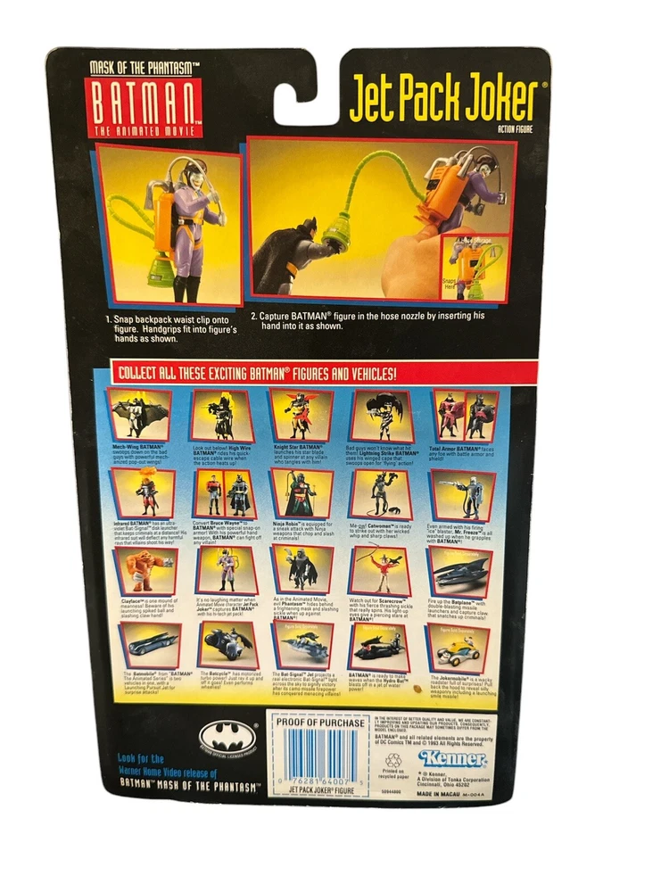 This Batman the Animated Movie Jet Pack Joker action figure is a must-have for any fan of the iconic superhero. Made by Kenner, this high-quality collectible features the Joker character from the classic movie series. It's perfect for display or play, and is sure to impress anyone who sees it. With its intricate details and vibrant colors, this action figure is a great addition to any collection. Whether you're a fan of the Batman franchise or just love collecting action figures, this item is sure to please. Don't miss out on the chance to own this amazing piece of memorabilia!
