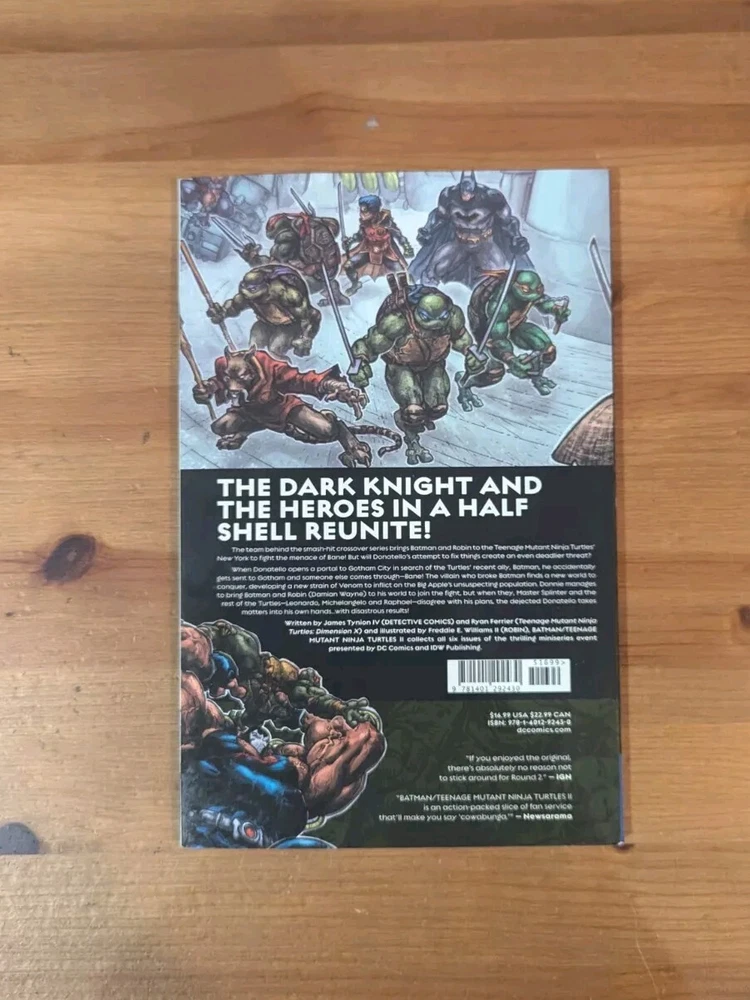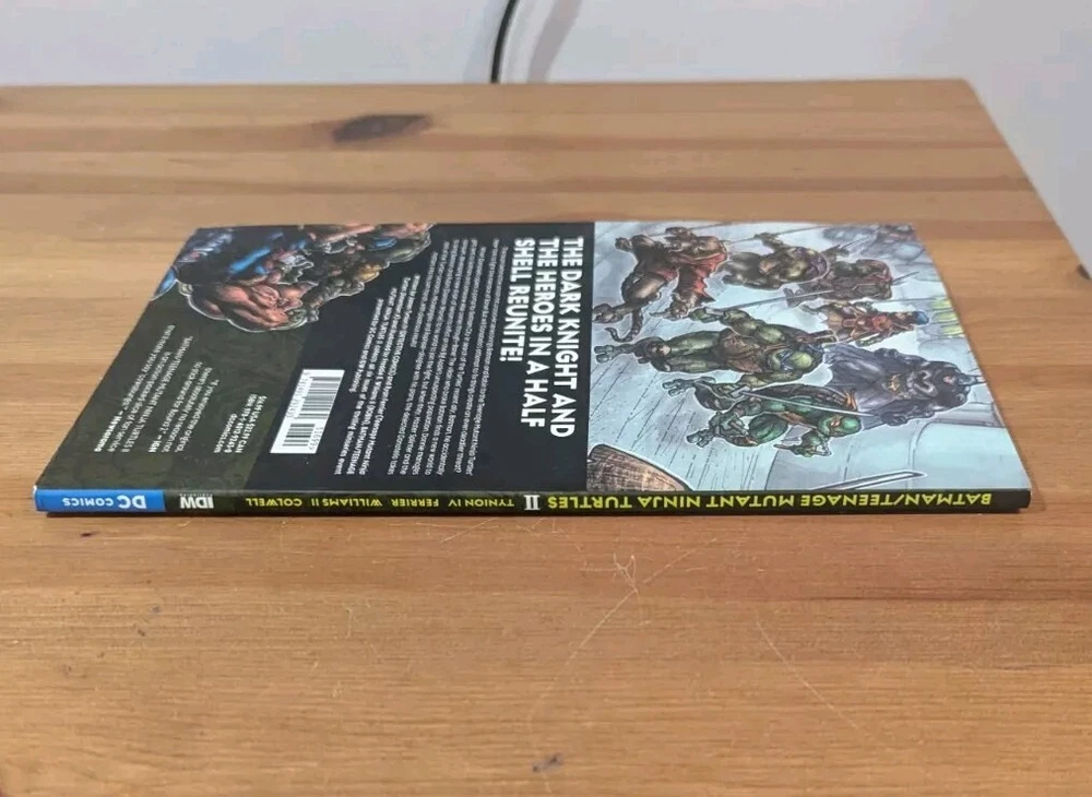 Genre:Adventure, Funny Animal, Martial Arts, SuperheroesSeries Title:Batman / Teenage Mutant Ninja Turtles IIgtin13:1401292437Publication Year:2019Format:Trade PaperbackEra:Modern Age (1992-Now)Tradition:US ComicsPublisher:DC ComicsArtist/Writer:Freddie Williams II, James Tynion IV, Jeremy Colwell, Ryan FerrierLanguage:EnglishUniverse:Teenage Mutant Ninja TurtlesCover Artist:Jeremy Colwell, Freddie Williams IICharacter:Bat-ManType:Graphic NovelIssue Number:1UPC:1401292437