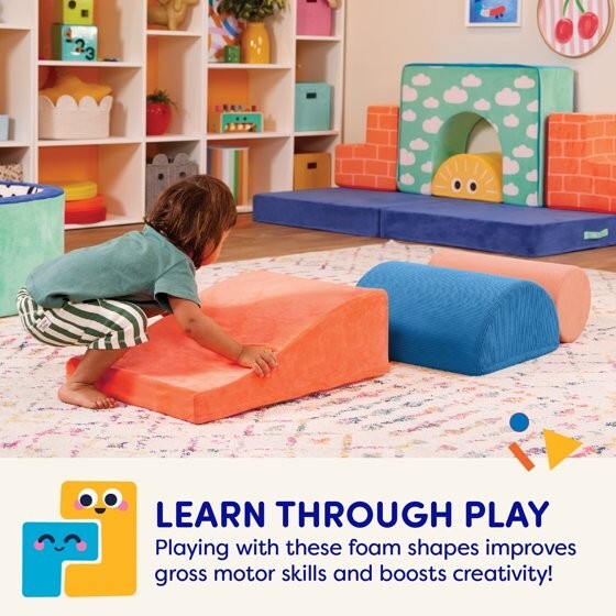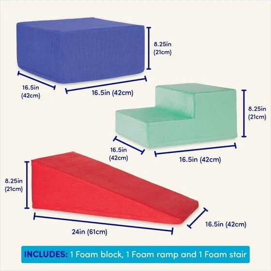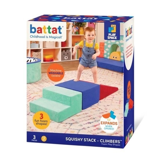 About this item Product details Stack, slide, and smile with the versatile Squishy Stack Climbers from Play Space by Battat! This set of 3 foam multicolor shapes includes one soft block, a ramp, and a stair. Stack them high, create an obstacle course, or add them to fun forts – the play possibilities are endless! The lightweight foam allows kids to easily rearrange their play space, while the different fabrics and textures add a sensory touch to playtime. As kids slide, walk, and climb over the super-soft shapes, they'll also be developing gross motor skills and staying active. Not to mention, all the covers are easily machine-washable! Recommended for kids 12 months and over. Build the ultimate playroom with the Squishy Stack Climbers and other wonderful toys from the Play Space collection by Battat. Climb, stack, and slide with a versatile set of foam play shapes for open-ended fun 3-piece set includes a foam block, a ramp, and a stair to build and create with The removable fabric covers are soft, textured, colorful, and machine-washable Playing with these foam shapes sparks creativity, keeps kids active, and improves gross motor skills The Battat Squishy Stack Climbers are recommended for toddlers 12 months and over More Details Brand: Battat Manufacturer: Battat Manufacturer Part Number: BT1848 Color: Multi-color Age Range: 12 Months & Up Gender: Unisex Assembled Product Dimensions (L x W x H): 14.20 x 7.90 x 17.35 Inches