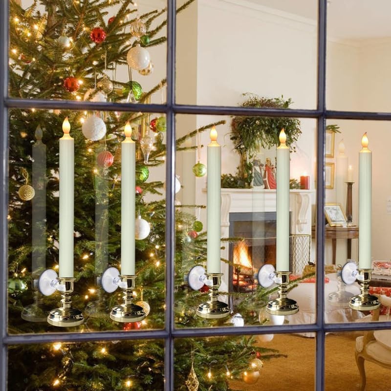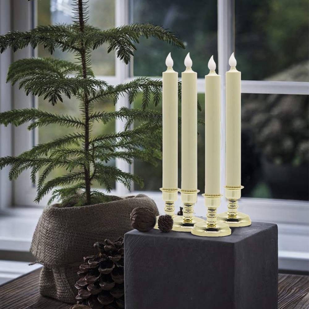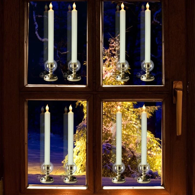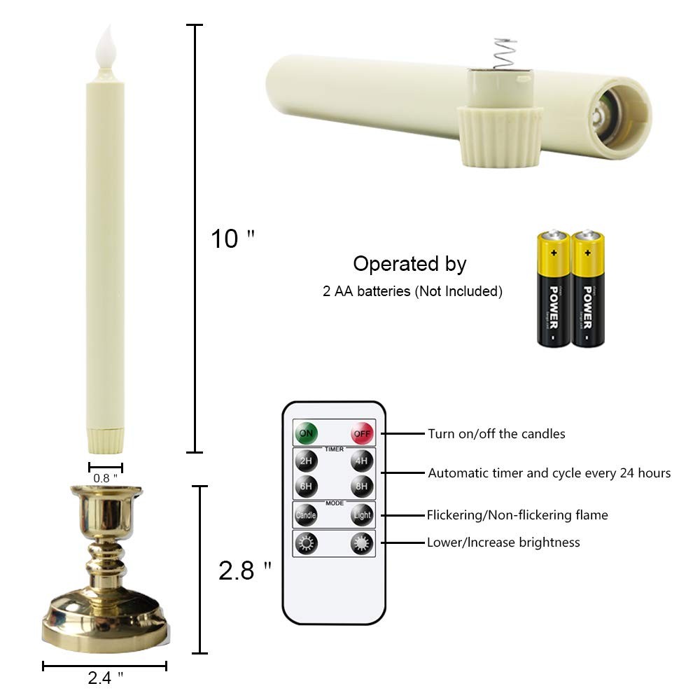 ➤MATERIAL&MEASUREMENT: The package including a pack of 6 flickering flameless taper candles with remote control and timer, made of plastic with wax finish in ivory color, the diameter of the candles is 0.8 inches, the height of the candles is 10 inches; there are 6 gold candle holders and suction cups included in the package, each candle operated by 2 AA batteries(not included). ➤10-KEY REMOTE: The included 10-key remote control allows you turn on/off the candles from a distance, set the 2H/4H/6H//8H timer, change the flickering flame or steady light mode, lower/brighten the brightness, convenient use and easy operation, in this way, you can put the candles anywhere you like. ➤FLICKERING FLAME: Wax finish candle sleeves plus the warm white flickering flame create warm and cozy atmosphere for your home, you can place them on tables and shellves with the included candle holders, you can also attach the taper candles on windows with included suction cups, eyecatching decoration. ➤SAFE & CLEAN: With these flameless flickering LED window candles, you will get rid of the worry and concern of fire related risk, annoying smoke and messy dripping. Kids and pets friendly, never worry about forgetting to extinguish candles when sleeping, buy once and can use for several seasons. ➤APPLICATION & GUARANTEE: Such beautiful and elegant tapered candles will be your necessary for your home once you use them for a time, they can be placed in your bedroom, fireplace, living room, bookshelves and anywhere that you could think of. All the LED candles from us will have the warranty of 90 days for replacement or refund, place the order with confidence.