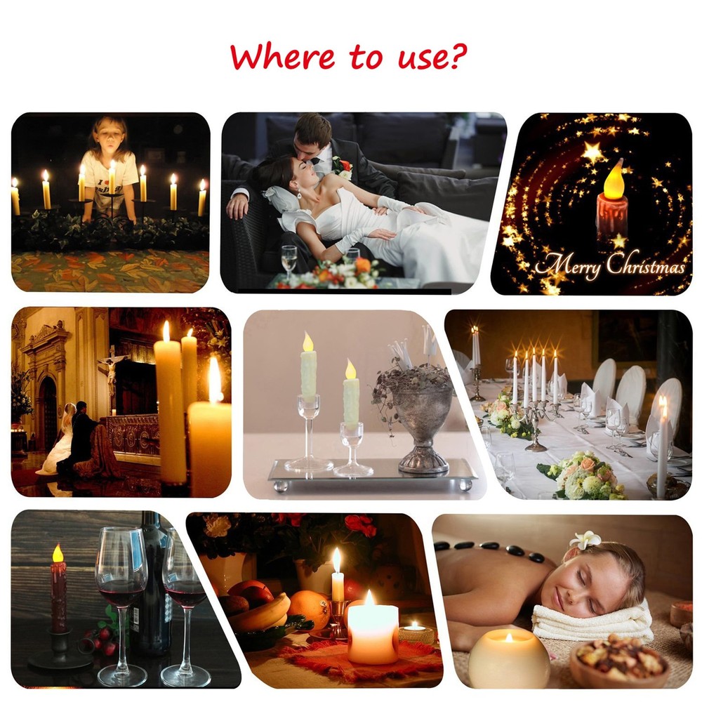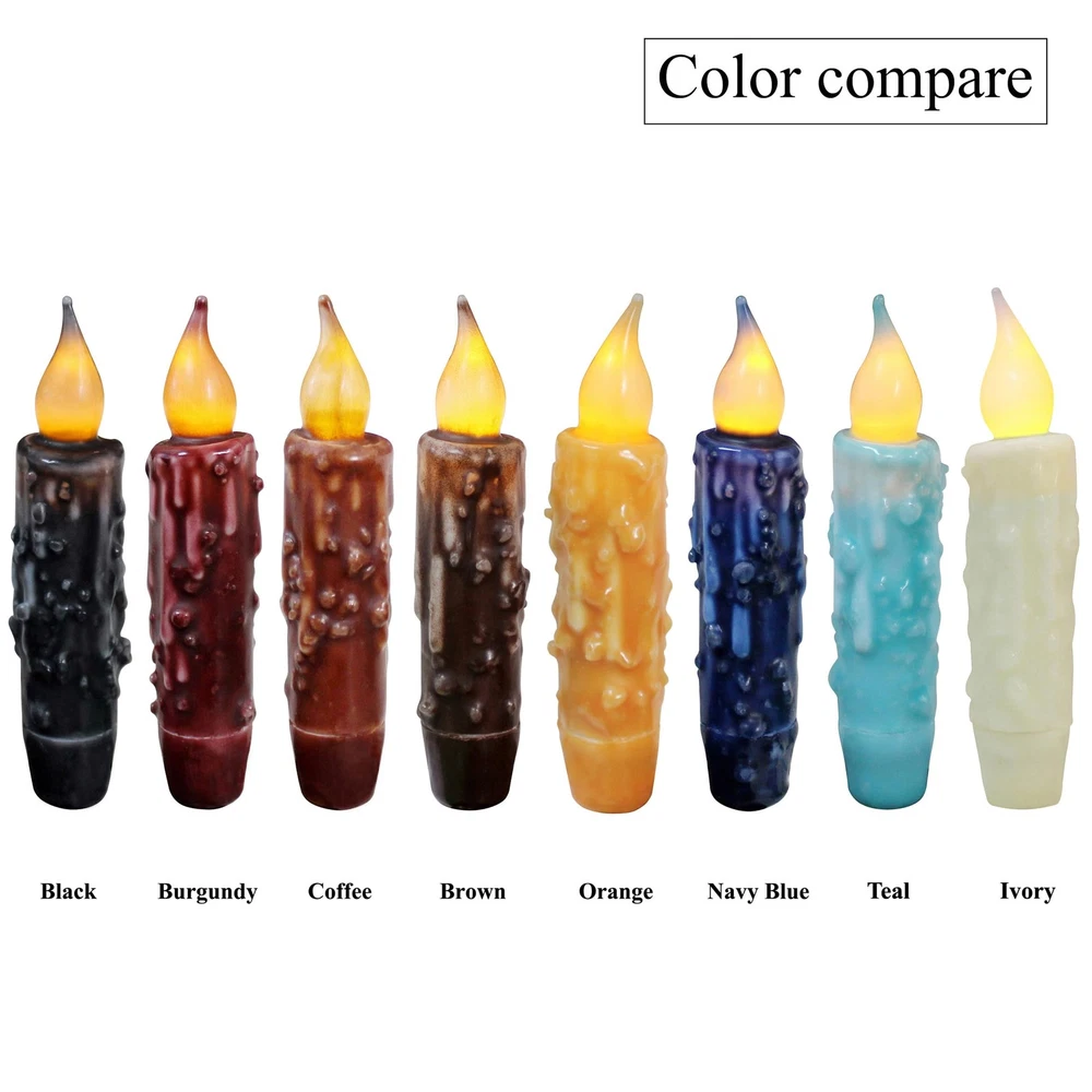 Flickering flameless lights bringing warm and pleasant to brighten sweet home. Decorative accents give you a cozy ambiance for any place you want, romantic and safe. Illuminate the fireplace mantel, countertop, bookshelf, tabletop, cabin, window with LED Flickering Flameless candles in candlestick. Great idea for home decorations, holiday decoration, Christmas, Thanksgiving, Halloween, New Year, Valentine's Day, dinner parties, wedding, birthday party, church, candle lights vigil, flower arrangement, other festival celebrate and more. Perfect gifts for family, friends, neighbors and acquaintances. CVHOMEDECO. have many years of hand dipped experience, welcome try and compare! Made of vintage-inspired wax hand dipped handicraft and classic textured finished. The drips down like a real candle and look amazing Measures of flameless candle is 4-3/4"L x 1"D, each battery operated candle uses 1 AA batteries ( Not included ), tighten or loose the cap on bottom of the battery operated candles for ON/OFF, timer setting the candle to stay on for 6 hours and then go off for 18 hours The base of flameless candles is tapered, perfectly fit any standard taper holder and taper accessories The farmhouse tapers candle use as a decorative accent piece for countertop, tables, shelves, walls, windows, candlesticks or any room. You're sure to find lots of uses for these charming handmade candles, whether you adorn a room, use as accents piece for any crafts projects or make them to your gifts. Primitives texture wax coating and flickering candlelight, offers a softly and warm light. Perfect for home decor, holiday décor, Christmas decor, Thanksgiving present, Halloween decor, New Year, Valentine's Day, dinner parties, weddings decor, birthday party, churches, candle light vigils, floral arrangements, other festival celebrate and more