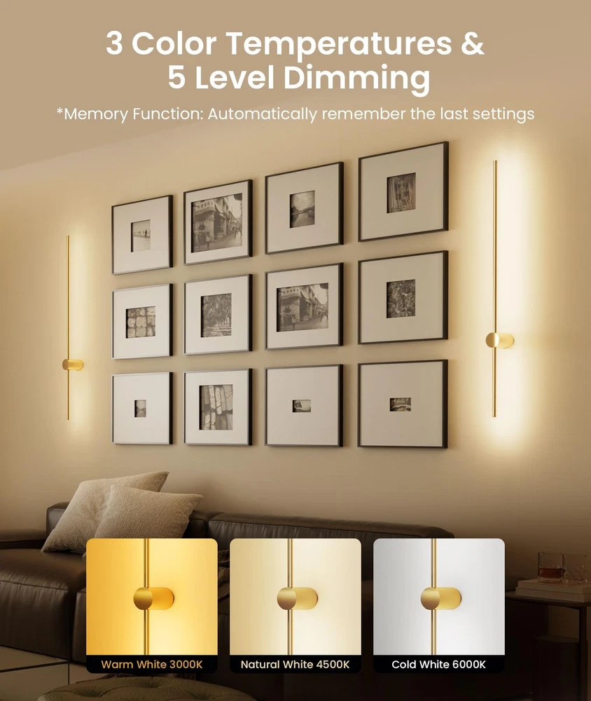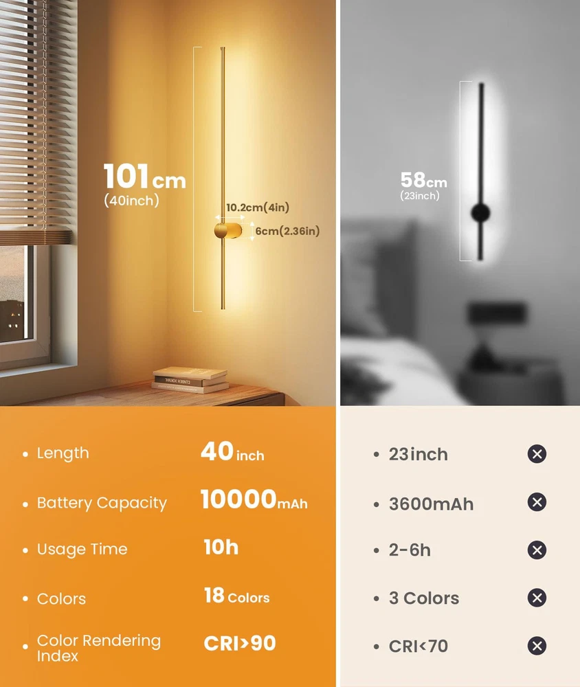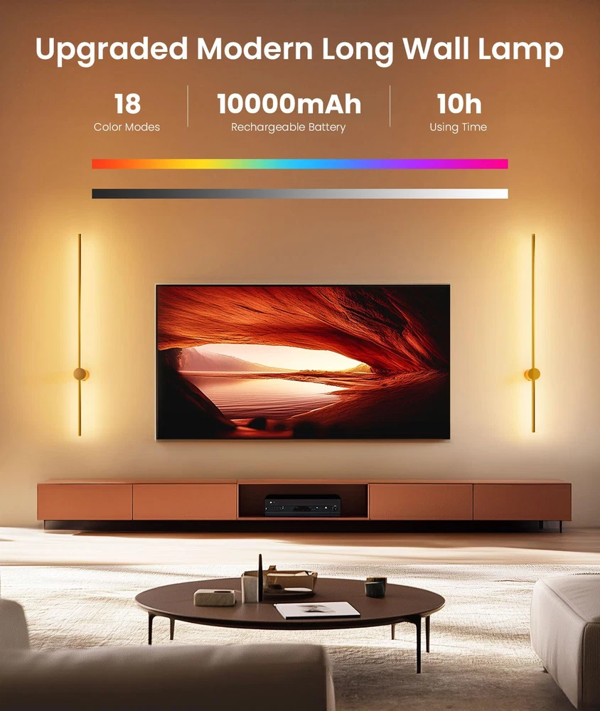 【High-capacity Battery】This battery operated wall sconce features a powerful 10,000mAh battery that charges in just 5 hours and offers an impressive usage time of 10 hours, making it perfect for many different scenes. 【Wireless & Easy to Install】Our rechargeable wall sconces redefine convenience with their hassle-free installation— no wiring or electrician needed, include all mounting hardware for quick and easy installation. The sleek, modern design effortlessly complements any indoor space, providing both practical lighting and stylish appeal. 【Dimmable & Remote Control】Customize your lighting experience with 3 adjustable color temperatures from 3000K to 6000K and five brightness levels (10%-100%), plus 15 RGB colors—all easily controlled via remote. Free your hands.(Note: Batteries are not included in the remote control.) 【Timer & Memory Function】This wireless wall sconces set of two include a 10-minute and 30-minute timer to help you save battery and reduce power use. It also has a memory function that retains your last color and brightness settings, so you don’t need to reset them after powering on again. 【Distinctive Design & Versatile Use】This wall sconce features a unique design and versatile functionality, with a streamlined aluminum body and an elegant matte black finish. Its minimalist yet sophisticated appearance seamlessly integrates with various interior styles. Ideal for enhancing the ambiance of living rooms, bedrooms, stairs, hallway and more. It combines modern aesthetics with practical lighting, making it a stylish and functional choice for any space. 【Service Starts Here】We stand behind our wall sconces with a full 12-month replacement service. If you encounter any issues or defects within this period, we offer a hassle-free replacement. Our dedicated after-sales service ensures that any questions or problems will be addressed within 12 hours. We are committed to providing top-notch support for your purchase.