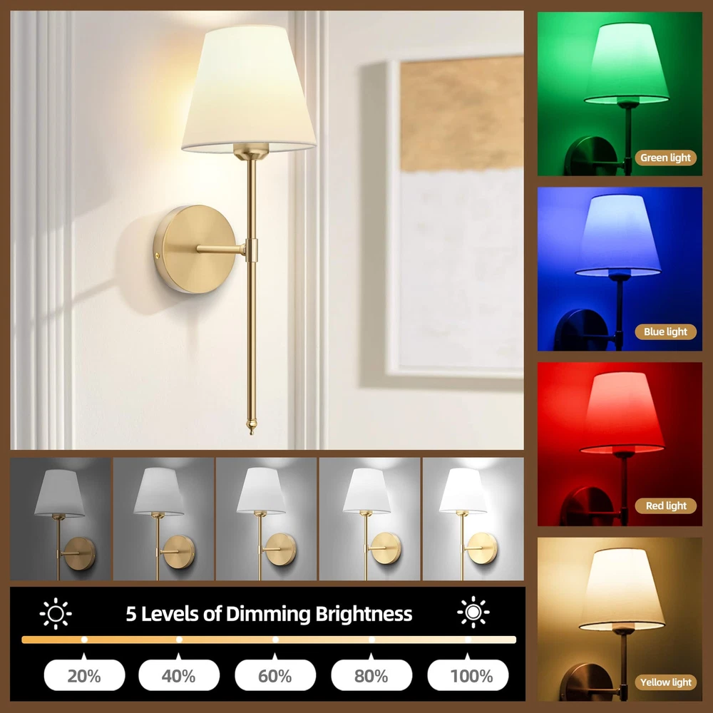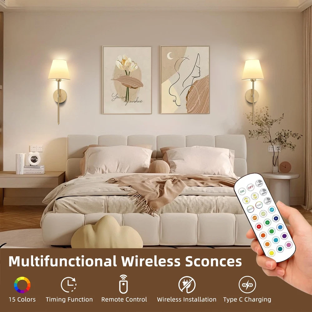 【Battery Operated Wall Sconce Set of 2】Unlike other wireless wall sconces with short battery life that often fail to work properly, ours have long battery life detachable bulb, which can be fully charged within 3 hours with our own Type-C charging cable.They can work continuously for more than 18 hours at medium brightness. Note: Do not use a fast charger over 5V to charge the bulb.What's more, these bulbs are soft, no dazzle, non-flickering, eye caring and longer lifespan.Ideal for creating a romantic ambiance on Valentine's Day and Christmas. 【Wireless Remote Customization: All Colors & Brightness】Choose 3 color temperature modes (3000K-4500K-6000K), 12 RGB colors, 5 brightness levels, 3 timing settings and night light mode through the remote control ensures you have the perfect light setting for any occasion, making it more energy-efficient. 【Easy to Install】 upgraded wall sconces features wireless design allows you safely install it anywhere without worrying about whether there is a socket or connection port. It minimizes damage to the wall and you can also replace it at any time. 【E26 Replaceable 15-Color RGB Bulbs Included】The wall lights come with 15-color RGB bulbs, allowing you to change the color to suit your mood or occasion. These bulbs have a lifespan of up to 40,000 hours, ensuring long-lasting and versatile lighting options. 【Perfect for Any Home Decor】These wall lamps are perfect for your living room, office, vanity, or even dark areas like hallways, closets, and corridors. We prioritize customer needs, providing high-quality products and excellent customer service. If you encounter any quality issues within 24 months, please contact us.