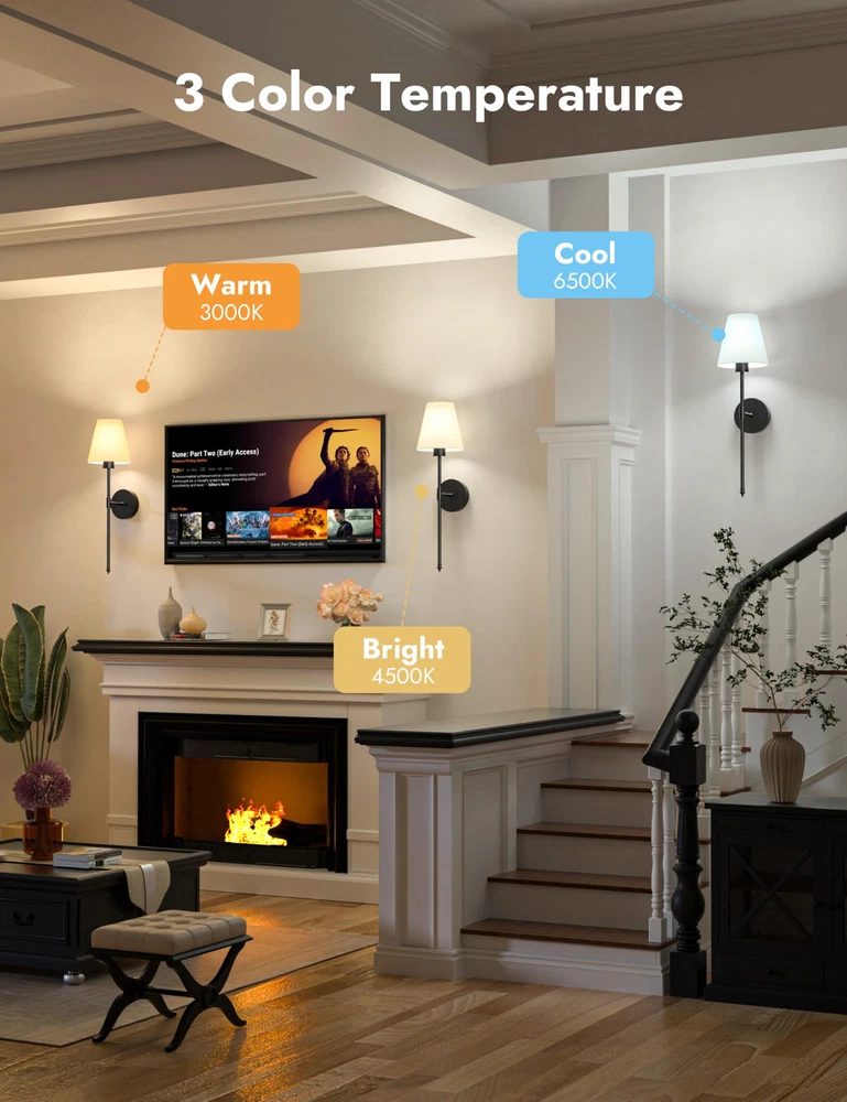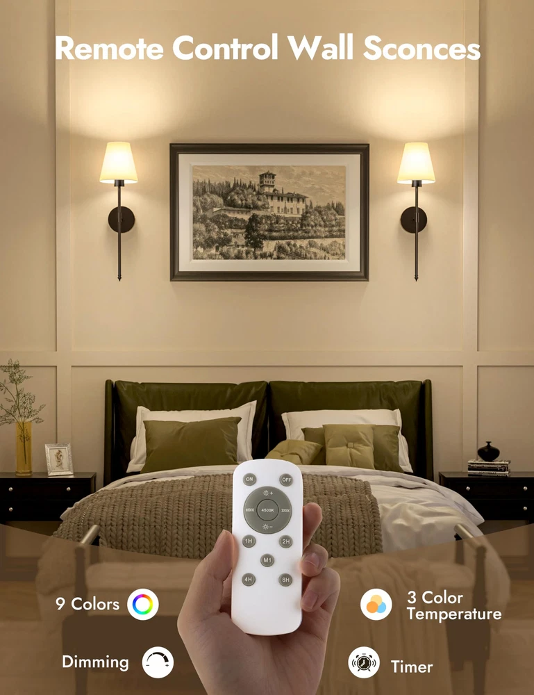Battery Operated Wall Sconce Set of 2,Black Rechargeable Wall Lights with 5200mAh Dimmable Detachable Bulbs,10 Colors Wireless Sconces for Bedroom Living Room Hallway 【Wireless & Easy to Install】wireless sconces set of 2 are battery - powered, coming with two rechargeable 5200mAH LED bulb. Wall sconces set of two battery operated eliminating the hassle of wiring within the walls, conveniently for users who don't want to damage the wall surface and those without pre - installed electrical wiring, or renters. Sconces wall lighting battery operated are suitable for bedroom, living room, hallway, bathroom, kitchen, and stairway etc, creating an elegant and stylish atmosphere for your indoor space. 【9 Lighting Colors】Our battery powered sconces set of 2 offers diverse lighting options. It has three color temperatures: 3000K creates a cozy and inviting atmosphere, 4000K provides a clear and natural illumination, and 6000K is bright and energetic. There are also six RGB colors to switch between. Whether for a party or daily use, you can easily customize the lighting to suit different moods and occasions. With the black sconces wall decor set of 2, creating the perfect lighting environment is a breeze. 【Dimmable & Energy Saving】300 Lumen/5200 mAH. The battery powered wall sconce offers four brightness levels: 25%, 50%, 75%, and 100%. Customize the light according to your needs and desired atmosphere. Whether for a relaxing night or tasks, switch between settings easily. The working time of the black wall lights battery operated depend on brightness. It lasts 72 hours at the lowest brightness and 25 hours at the highest. 【Timer and Memory Function】You can easily set a timer for wall lamps battery operated to automatically turn off after 1 to 8 hours. This helps extend the battery life and reduces unnecessary power consumption. Even better, when you turn off and then turn on this rechargeable wall sconces set of 2 again, it will remember the color and brightness settings you last used, eliminating the hassle of re - configuration. 【100% Satisfaction Service】: We proudly stand behind all of our products 100% and offer a full 2-year service for our rechargeable wall lights. This will cover you if the wireless lights for wall indoor stop working or there are any defects within those 2 years. 【100% Satisfaction Service】We proudly stand behind all of our products 100% and offer a full 2-year service for our wall sconces. This will cover you if the black wall lights stop working or there are any defects within those 2 years.