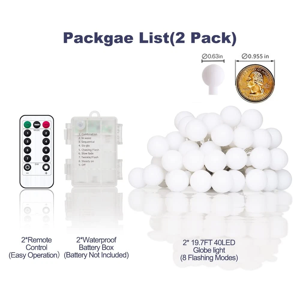 2 Pack 19.7FT Battery Powered Globe String Lights with remote control for indoor and outdoor decorations Feature: Twinkle warm white color Globe fairy lights, beautiful decorate your garden,patio,living room, dormitories, galleries, also ideal for birthdays, wedding, party. It can be easily put or hung on walls, windows, curtains and etc. Perfect for Ramadan, Eid, Christmas, Valentine's Day, party, wedding, home, festival, holiday, restaurant, hotel, commercial building, shopping center etc Warm white LED Globe string light is suitable for creating harmonious and romantic atmosphere.Makes everyone enjoy the best moment, share the happiness and built an unforgettable memory Specification: Light Color: warm white LED Count: 40 pcs /string lights Length: 19.7ft per globe string lights Power Source: Batteries Powered 8 Mode Button: Combination/in wave/sequential/slo glo/ flash/slow fade/ twinkle/steady, Package: 2 x 40 LED globe string light Notes: Requires 3 AAA batteries (not included) For longer battery life, use premium alkaline batteries 【2Pack 40 LED Globe FAIRY STRING LIGHT】 19.7FT/6M Globe fairy lights With 40 Super Bright LED beads, 0.63inch (16mm) bulb diameter.2Pack Globe string lights give off soft warm white to create a warm and wonderful atmosphere, Makes everyone enjoy the best moment, share the happiness and built an unforgettable memory 【Battery powered&Remote Control】Requires 3 AA batteries (not included) , Each set includes a small waterproof battery compartment with around button to adjust the LED Globe String Lights mode.Remote Control the LED Globe fairy lights with 8 modes ( Combination/in wave/sequential/slo glo/ flash/slow fade/ twinkle/steady, ) to create a warm, joyful, romantic atmospheres. 【Gorgeous Decorative Lights&IP 65 Waterproof Design】This LED string lights is of ultra bright white warm color micro LEDs that create a light fairy twinkle effect. IP 65 Waterproof Design Perfect for indoor and outdoor decorations. Ideal for Ramadan, Eid, Christmas, Valentine's Day, party, wedding, home, festival, holiday, restaurant, hotel, commercial building, shopping center etc 【Energy Saving&Safe for using】Updated power-saving LED Globe string lights, saving more energy than traditional lights. And Longer lifespan. Twinkle Globe Lights is low voltage and will not overheat, cool to touch,very safe to use and enjoy your happy time. 【What You Get:】 2 Pack 19.7FT battery operated LED Globe String lights with remote control and our ’s professional & kind service. Customer’s satisfaction is extremely important to us, If you have any question on the battery powered led star lights , Please don’t hesitate to contact us. We will do our best to help you to solve it.