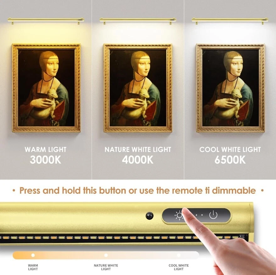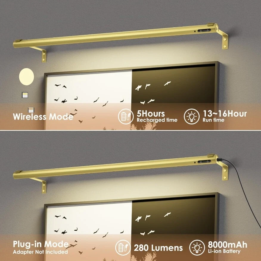 Free eBay listing template designed by dewiso.com Welcome to My Stores, Happy Shopping! ------------------ Battery Operated Wireless Picture Light,Rechargeable/Plugged in 31.5Inch Paintin About this item 【Modern Led Display Picture Lights】The wireless picture light come with (3000k warm light/4000k warm white light/6500k cool white light),enough for the brightness needed. Also the diamond art pictures light no need battery replacements, No wires. time switch. The integrated design makes it look more cool. 【Large Battery Operated Gallery Lights】Built-in 8000mAh rechargeable lithium battery, charging 5-6 hours and normal brightness can last for 16 hours. Magneted attached make easy to charging. wireless remote control, portable lighting your art. 【Easy Install&Easy Control Wall Picture Light】The picture light come with magnetic attach function, easy remove anytime. screwed in to make more secure, also it come with two simple control remote. 【Multifunctional Wall Light】We provide a 2.5 meter long charging cable that can be used as a plug-in light when powered on with a 5v2a adapter. Please note that we do not provide an adapter. Not just a picture light on wall but also can be mirror headlight、painting light、art light、dartboard light、portrait light etc. 【The Wall Sconce Included】1*picture light with 2pcs holder、2*control remote、1*TYPE-C charging cable (one meter)、1*TYPE-C charging cable(2.5 meter)、1*Manual、9pcs screws Product Description Finish Type Painted Bulb Base Wedge Product Dimensions 1.18"D x 31.5"W x 1.18"H Item Weight 15.52 ounces Shade Color White Switch Type Touch Style Modern Color Gold Special Feature Adjustable Color Temperature Light Source Type LED Material Aluminum Room Type Bedroom Power Source Battery Powered Shape Round Controller Type Remote Control Number of Light Sources 140 Connectivity Technology Bluetooth Included Components Remote Control Mounting Type Wall Mount Wattage 5 watts Number of Items 1 Lighting Method Adjustable Control Method Remote Indoor/Outdoor Usage Indoor Specific Uses For Product Home Water Resistance Level Not Water Resistant Installation Type Flush Mount Voltage 5 Volts (DC) Brightness 280 Lumen Part Number PC-80c Item Weight 15.5 ounces Batteries 1 Lithium Ion batteries required. (included) Finish types Painted Special Features Adjustable Color Temperature Shipping Tracking number: Available We use a selection of shipping services such as UPS, FedEx, USPS etc. We only ship to the lower 48 states, no APO/FPO addresses or PO Boxes allowed. Local pickups and combined shipping options are not provided at this time. Contact us We can be contacted at any time through eBay messages if you have any questions, comments or product requests. We will respond to you within 24 hours and do our best to help you out! We encourage our customers to contact us with any questions or concerns! We'd like to be sure you are completely satisfied with your purchase