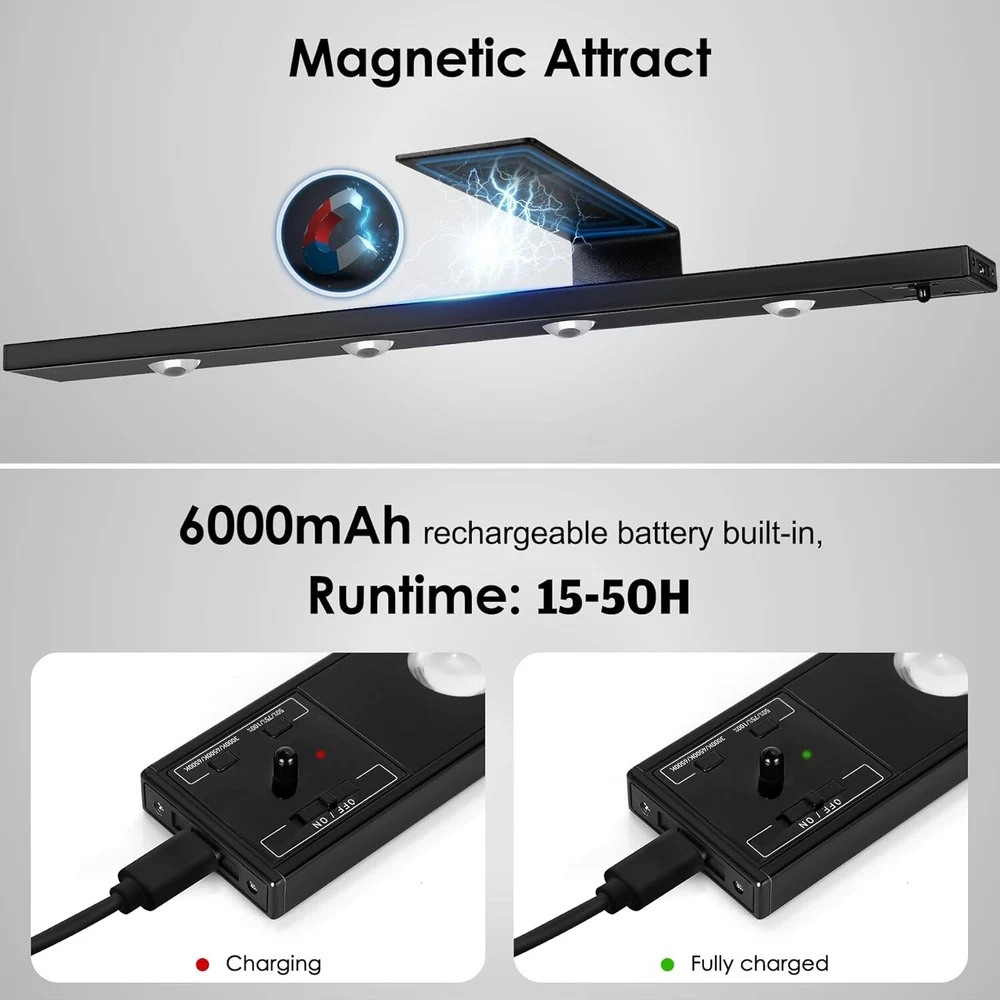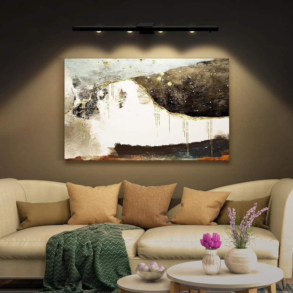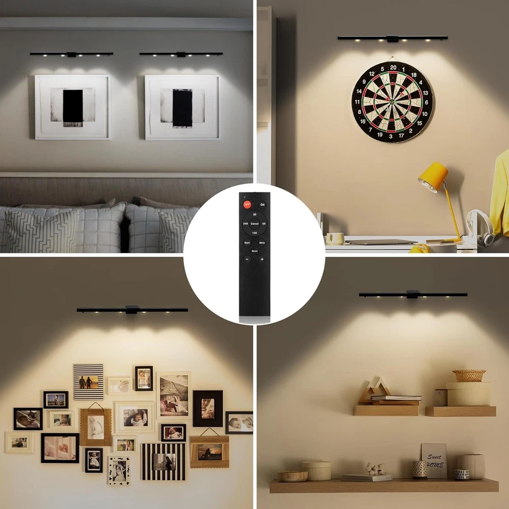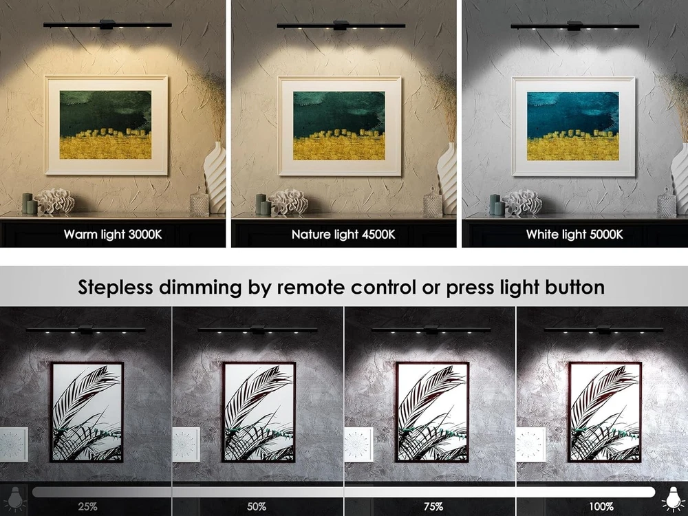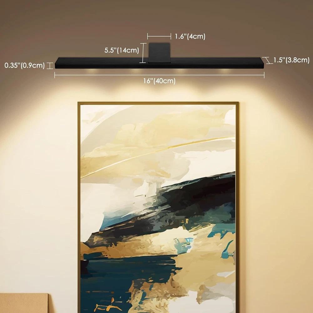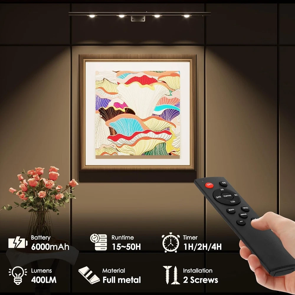 Picture Light with Remote Battery Operated,Wireless Painting Light Art Light 400LM,Full Metal 6000mAh Rechargeable Display Wall Picture Light for Gallery with 3 Lighting&Dimmer Timer-Off Description; 【2 switch modes wireless picture light】The full metal picture light can be operated by remote or manual button. Upgraded ultra thin and sleek, looks more artist for wall pictures artworks. 【Magnetic attach and rechargeable painting light】The light bar is magnetic attach to the bracket, easy take down to charge. The upgraded 6000mAh rechargeable battery can last 15~50hours and support 3~4hours fast charging. And the 400lumens illumination can be bright enough for your wall pictures arts. 【3 Lighting colors and brightness dimmable timer set】The led picture light has 3 lighting colors :warm light/nature light/white light(3000K/4500K/6000K). And the brightness is dimmable for any levels from 100%~10% and from 10%~100%. Also you can preset a timer to auto-off in 1H/2H/4H to save battery. 【Size and installation】The wireless picture light is 16inch long and 5.5inch wide. Easy installed by 2 screws (included). 【Patent products and packing list】The battery operated picture light is original designing with a patent. Packing list : 1x picture light; 1x type-C usb charging cable; 1x remote control; 1x user manual ; 3x screws. Any question ,please kindly message us , we will be happy to help you and offer a good solution to you .
