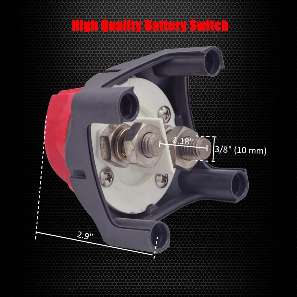 Heavy Duty: ABS plastic housing, durable made for safety use, rear cover insulates terminals against any short of circuits, equiped with 4 sets of bolts. Specification: On/Off 2 positions, 275 A continuous at DC 12V, 455 A intermittent at DC 12V, 1250 A momentary at DC 12V. Compatible: used for DC 12 - 48 V systems to isolate and secure the electrical system, can stand alone or be locked together with other switch. Purpose: eliminate any power draw from the battery when vehicle or boat is not in use, disconnects the battery safely. Copper terminal stud size: 3/8" (10 mm) x 2, very easy to install, universal used for car, vehicle, Rv and boat, also electrical equipment's switch. Ampper battery switch, battery power master switch disconnect isolator for car, vehicle, Rv and boat. Specifications: 1, ABS plastic housing, durable made for safety use. 2, Rear cover insulates terminals against any short of circuits. 3, On/Off 2 positions. 4, Copper terminal studs with nuts and washers. 5, 4 mounting screw holes. 6, 275 A continuous at DC 12V, 455 A Intermittent at DC 12V, 1250 A momentary at DC 12V. 7, Used for DC 12 - 48V systems to isolate and secure the electrical system. 8, Can stand alone or be locked together with other switch. 9, Eliminate any power draw from the battery when vehicle or boat is not in use. 10, Disconnects the battery safely. 11, Universal used for Car, Vehicle, RV and Boat. 12, Used as electrical equipment's switch. 13, Size: 2.68" x 2.68" x 3.07". Complete kits includes: 1 x battery switch. 4 sets of mounting bolts. 100% Satisfaction. No reason for return or change. Order it now!