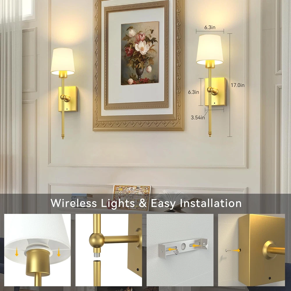 【Long Battery Life Wall Sconces】Our battery operated wall sconces set of 2 feature a 6000mAh rechargeable battery(larger capacity than most wall lamps on the market), after fully charged, The battery wall light can last for up to 25 hours at maximum brightness and 72 hours at the lowest setting. It will seamlessly fit into any indoor area, adding function and style while creating a pleasant ambiance with its wireless installation. Plus, you won't have to worry about power outages 【Wireless Sconces & Easy Installation】 NO Wiring Required! Our rechargeable wall sconces set of 2 are renter-friendly and incredibly easy to install: 1. Install the lampshade, bulb, and battery compartment( which is easier to take out and charge), 2. Use the included screws to mount the sconce light on the wall(Sorry, please do not use double-sided tape). Comprehensive instructions and video guides are provided. For any assistance, feel free to reach out to us anytime 【3 Color Temperatures & Brightness Adjustable】These battery wall sconces with remote control offer 4 color temperatures from 3000K-6000K. This cordless wall scone also enables you to adjust the brightness from 20% to 100%, allowing you to set the ideal ambiance for any event. With the ability to control multiple sconces simultaneously, eliminating confusion 【Timer & Memory Function】You can set a timer for the battery-powered wall sconces to automatically turn off after 0.5/1/2/4 hours through the remote control, which helps to preserve battery life and reduce unnecessary power consumption. Our battery sconces remember your last setting. When switched back on, it seamlessly resumes the mode you left it in, eliminating the need for repetitive adjustments and saving you precious time 【Versatile Indoor Wall Lights】The battery wall sconces set of 2 often combine practicality with aesthetics, this gold battery operated wall lamp exudes elegance and excellence, making it suitable for a variety of areas such as bedrooms, living rooms, hallways, kitchens, bathrooms, staircases, fireplaces, TV walls, pictures. our sconces wall decor is a perfect option to elevate the indoor lighting and decoration of your home 【Worry-free service】offers 2-year maintenance for these rechargeable wall sconces set of two. If you have any questions, please feel free to tell us (Log into your Amazon Account and find the order, then contact the seller and write a message, and problems will be addressed within 12 hours). Please rest assured to buy!