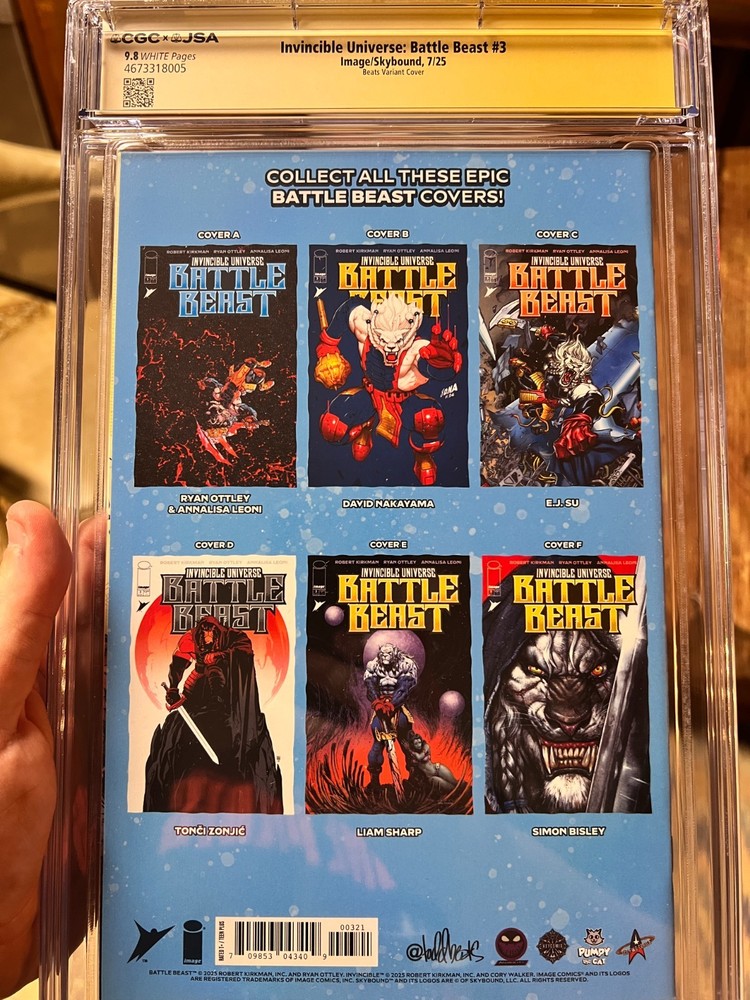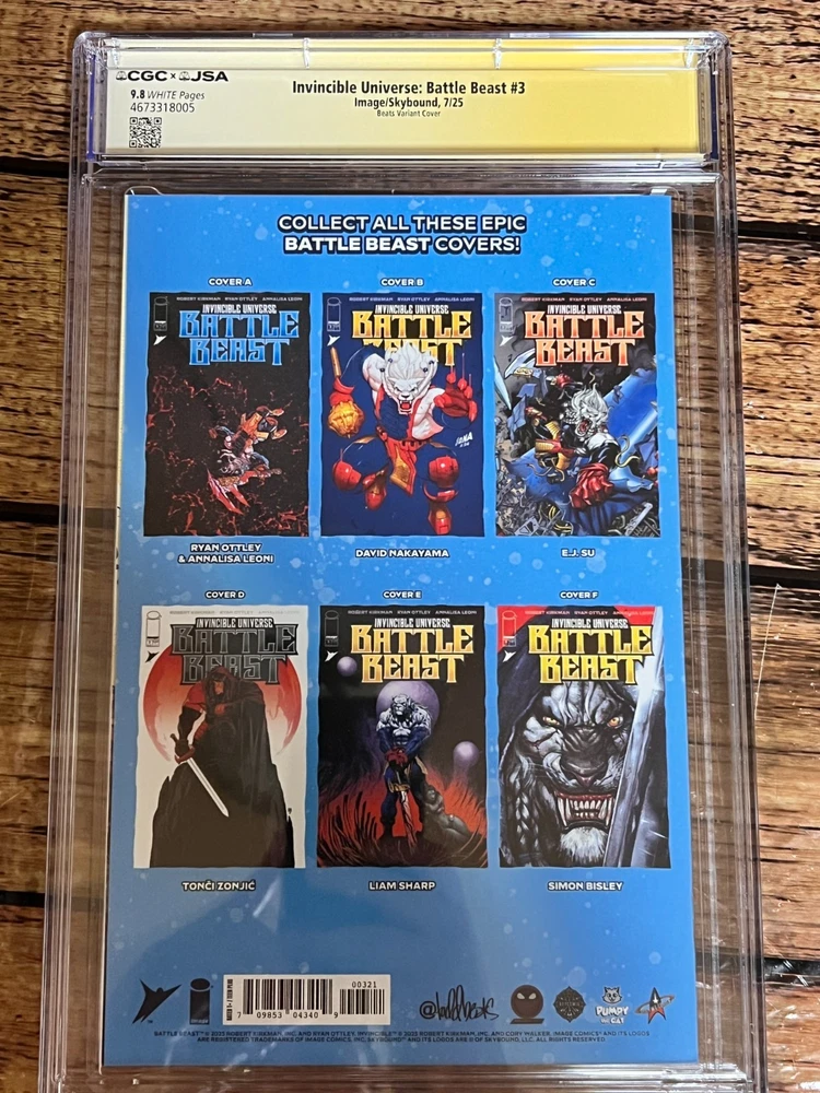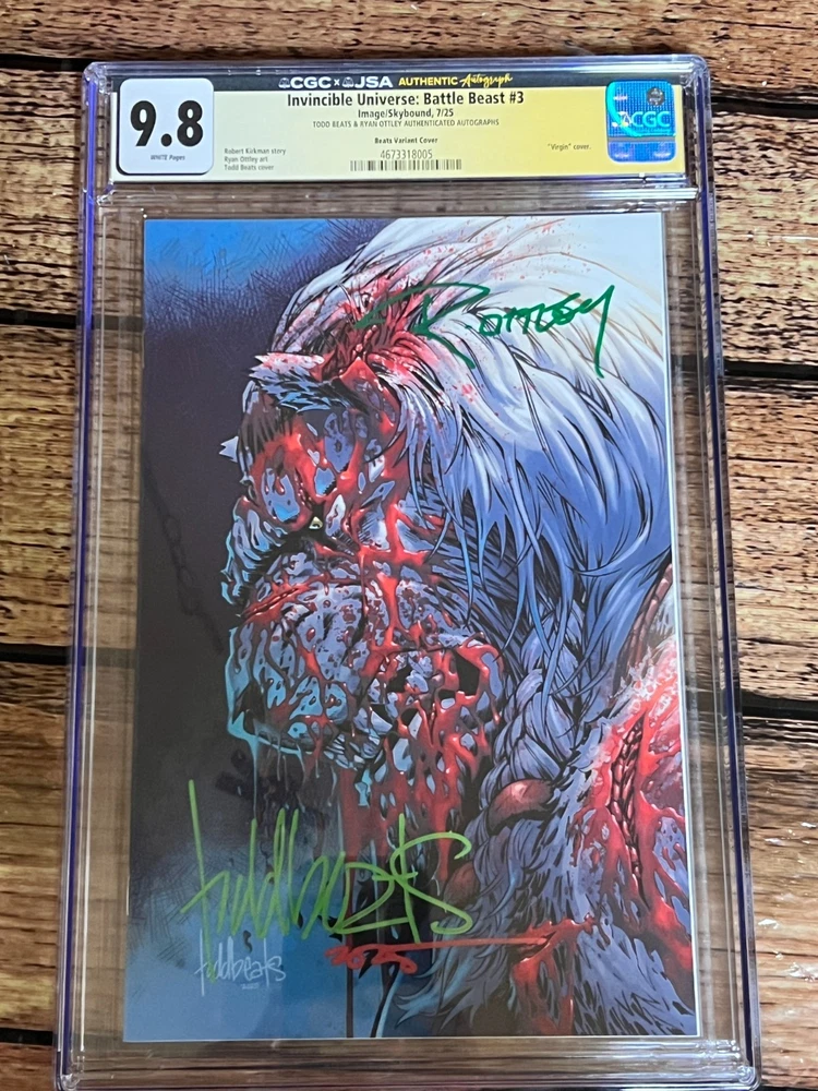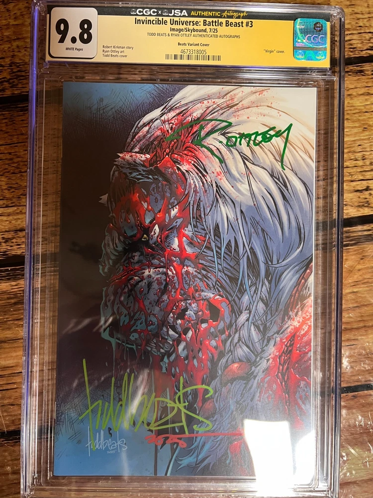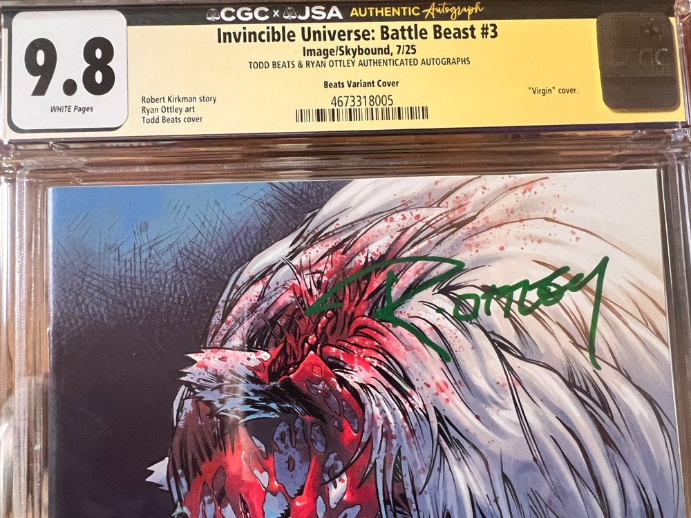 Up for sale is this gorgeous copy of Invincible Universe: Battle Beast #3 CGC 9.8 Double Signed by Todd Beats and Ryan Ottley! This cover is absolutely gorgeous with so much color! Guarenteed to look good in your personal collection! ITEM DETAILS Title: Invincible Universe: Battle Beast #3 Publisher: Image / Skybound Grade: CGC 9.8 (White Pages) Variant: Beats Variant Cover (Virgin) Signatures: β Todd Beats (Cover Artist) β Ryan Ottley (Invincible / Battle Beast legend) Label: CGC x JSA Authentic Autograph Certification #: 4673318005 Year: 2025 Why Should You Buy This Book? π₯ Stunning, ultra-violent Battle Beast artwork π₯ Dual authenticated signatures = BIG collector value π₯ High-end CGC 9.8 grade with white pages π₯ Virgin cover = clean, display-ready centerpiece π₯ Perfect for Invincible fans, Battle Beast collectors, and signature hunters SHIPPING & CONDITION β Ships well-packed and protected β CGC case is clean and clear β Comes exactly as shown in photos