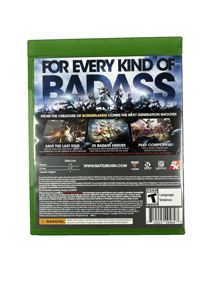 The "Battleborn" game is designed for the Microsoft Xbox One console and published by Microsoft. This action-packed video game offers players the opportunity to engage in epic battles using various characters and weapons within a futuristic setting. With intense gameplay and stunning graphics, "Battleborn" is sure to provide hours of entertainment for fans of the genre.