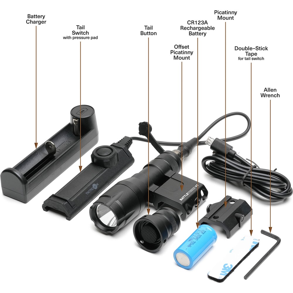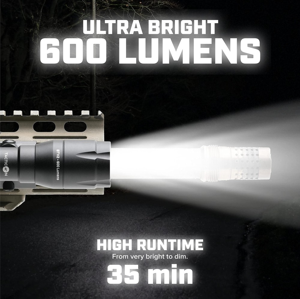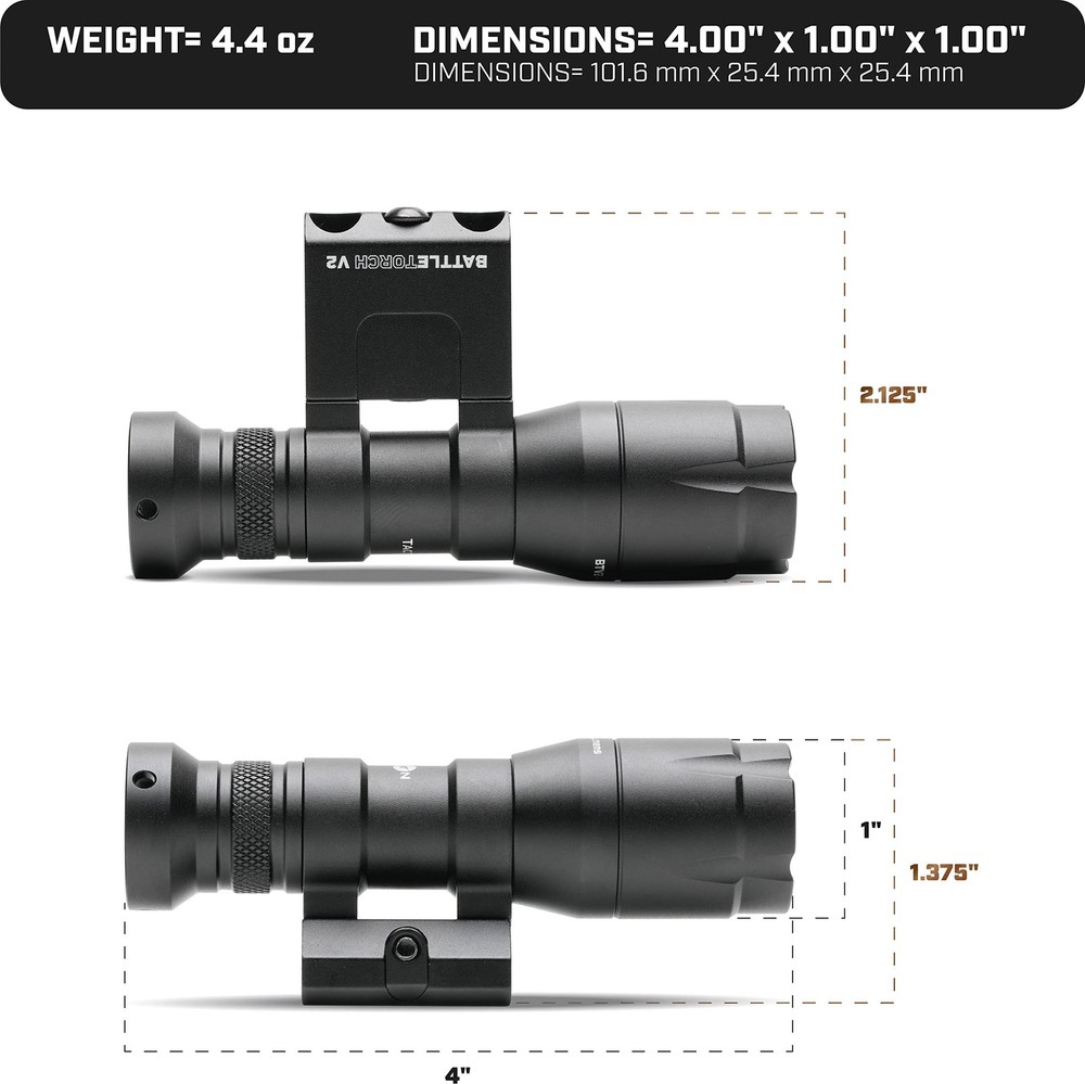 ✔ COMPACT DESIGN FOR CIVILIAN AND DUTY USE At four inches from end to end, this light takes up a minimal amount of space. Perfect for weight savings, minimal space usage, or working in conjunction with Night Vision Devices. The durable nature and beam output of this light make it a great fit for any civilian, law enforcement, or military use. ✔ VERSATILE Inline and offset mounting options included with this light make for a hospitable experience when running with or without a pressure switch and Night vision devices. The light can be mounted on either side of the rifle to facilitate preference or variations in the user’s dominant hand. The two included endcaps allow for both push button and pressure switch light activation. The included pressure switch mounts directly to any 1913 picatinny rail section and has both a momentary and constant on feature when deploying your light. ✔ DURABILITY Durability is always one of our strongest considerations. The Battletorch V2 is machined of 6061-T6 aluminum and extensively tested in harsh environments using both light and heavy recoiling weapon platforms. BLAZING BRILLIANCE: Crafted from rugged 6061-T6 aluminum and with an astounding 600-lumen output, our gun light pierces through the darkness, guiding your way with unwavering clarity. Whether you're navigating treacherous terrain or securing your perimeter, this rifle light stands as your unwavering al POWER IN THE PALM OF YOUR HAND: This rifle flashlight with sleek dimensions of 4" (W) x 1.375" (D) x 1" (H) weighs just 4.4 oz. Powered by a single 123A battery, our rifle lights deliver an impressive 35-minute runtime. Plus, we've got your back with a rechargeable 123A battery and charging station included in the package. VERSATILITY UNLEASHED: All our tactical flashlights for rifle comes complete with both an inline and offset picatinny mount, giving you the freedom to decide your ideal light positioning. This flashlight for gun is made to excell in wet or humid environments, thanks to its sealed design. SERVICE & SUCCESS – A VETERAN'S LEGACY: At - a disabled combat veteran-owned company, we know exactly what it takes to provide reliable and effective equipment. We produce only gun lights that we use ourselves and can fully stand behind. CUSTOMER-FOCUSED SERVICE: We're a real USA company with real humans answering phones to answer your questions. A disabled combat veteran-owned company based in the USA, with take pride in our human interaction with customers to answer questions.