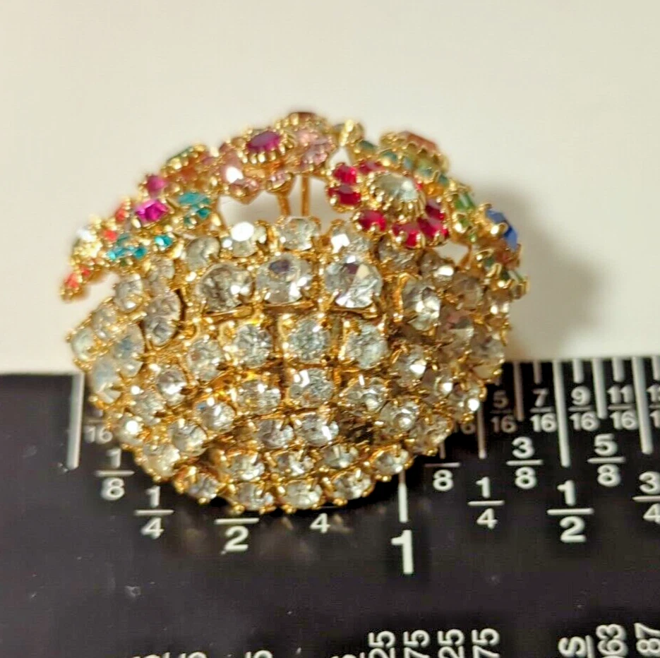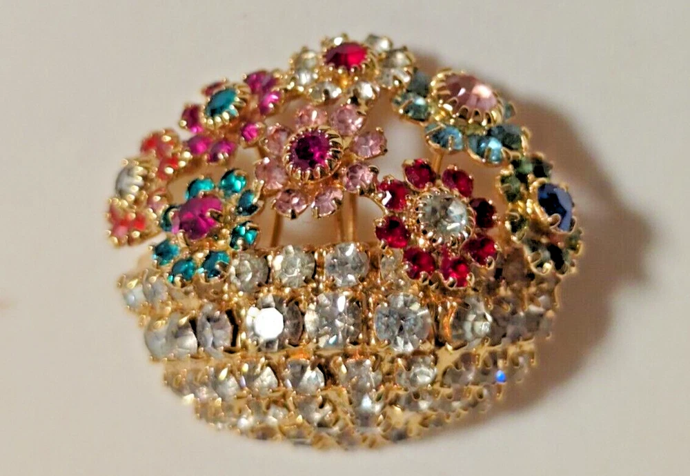 Bauer Flower Basket Pin/Brooch with Clear Rhinestones Basket Multi-Colored Flowers Prong Set Brooch by Dorothy Bauer. In good condition, Preowned and signed on the back. Display not included. **Please do not bid if your feedback is less than 10. ** I've had too many non-payments or receive notice from eBay about other issues. Before you purchase, please avoid anything that would warrant a transaction cancellation and make sure to put the correct shipping address at check out. I won't be able to change your address manually or ship to another address. LOOK AT ALL PHOTOS before bidding! Bid Responsibly. If you are unhappy when you receive the item, communicate with me before leaving negative feedback. The items are preowned or have come from an Estate even when NEW. That means someone never wore them and they have original tags. Please Note: I do not accept offers and do not end my auctions early for anyone. I do not clean any items; I leave that up to the new owner. PLEASE READ: Reminder when shipping first class, it will take longer to ship. The postal service is short staffed, and it takes longer to deliver the package. There is a tracking number. I have found that not all post offices will scan that number, so it may look like it's sitting in one place for a longer time. **If noted shipping USPS Priority mail, that is what I do ship on high priced items, due to cost of the item. **Please do not ask me to ship differently, I will not change shipping. I carefully place items in small box with padding place in a box then package in a priority box. Please email me with any questions