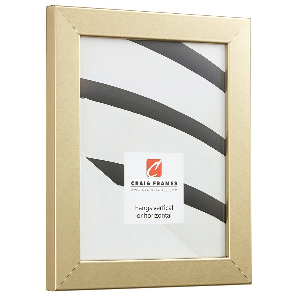 Modern style; brushed gold appearance; smooth laminate wrap finish (NOT ACTUAL METAL) Frame includes: clear acrylic facing, rigid cardboard backing and wire hanging hardware kit (some assembly required) Frame holds a 24 by 36-Inch photo/print/poster (viewable area reduced by .25 inches on each side due to frame lip) Frame moulding is 1.25 inches wide; solid MDF construction Frame is designed for WALL HANGING only (hanging hardware allows for portrait or landscape orientation)