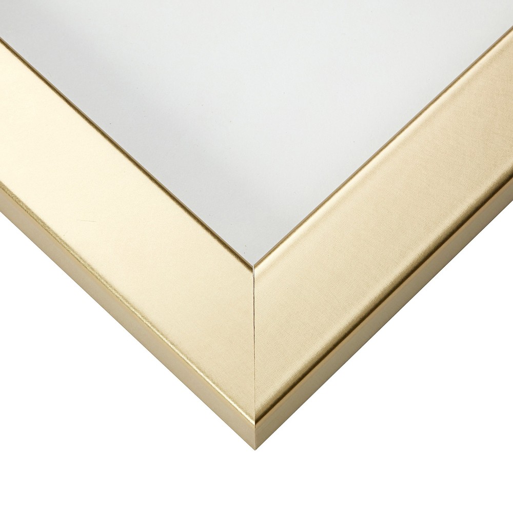 With clean rectilinear lines and a square profile, the Bauhaus 125 picture frame is ideal for most modern decor needs. Featuring molding with a composite wood core encased within a laminate wrap, this sleek 1.25 inch wide picture frame molding comes finished in Brushed Gold. With some smooth white matting you can elevate your prints to the next level. Sharp and bold, the Bauhaus 125 Brushed Gold picture frame is the perfect touch of modern. Modern style; brushed gold appearance; smooth laminate wrap finish (NOT ACTUAL METAL) Frame includes: clear acrylic facing, rigid cardboard backing and wire hanging hardware kit (some assembly required) Frame holds a 24 by 32-Inch photo/print/poster (viewable area reduced by .25 inches on each side due to frame lip) Frame moulding is 1.25 inches wide; solid MDF construction Frame is designed for WALL HANGING only (hanging hardware allows for portrait or landscape orientation)