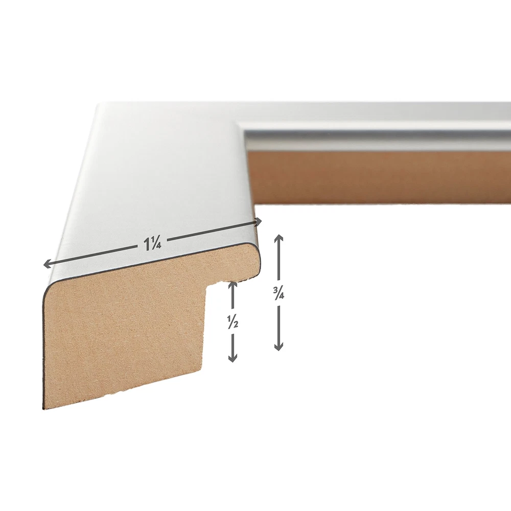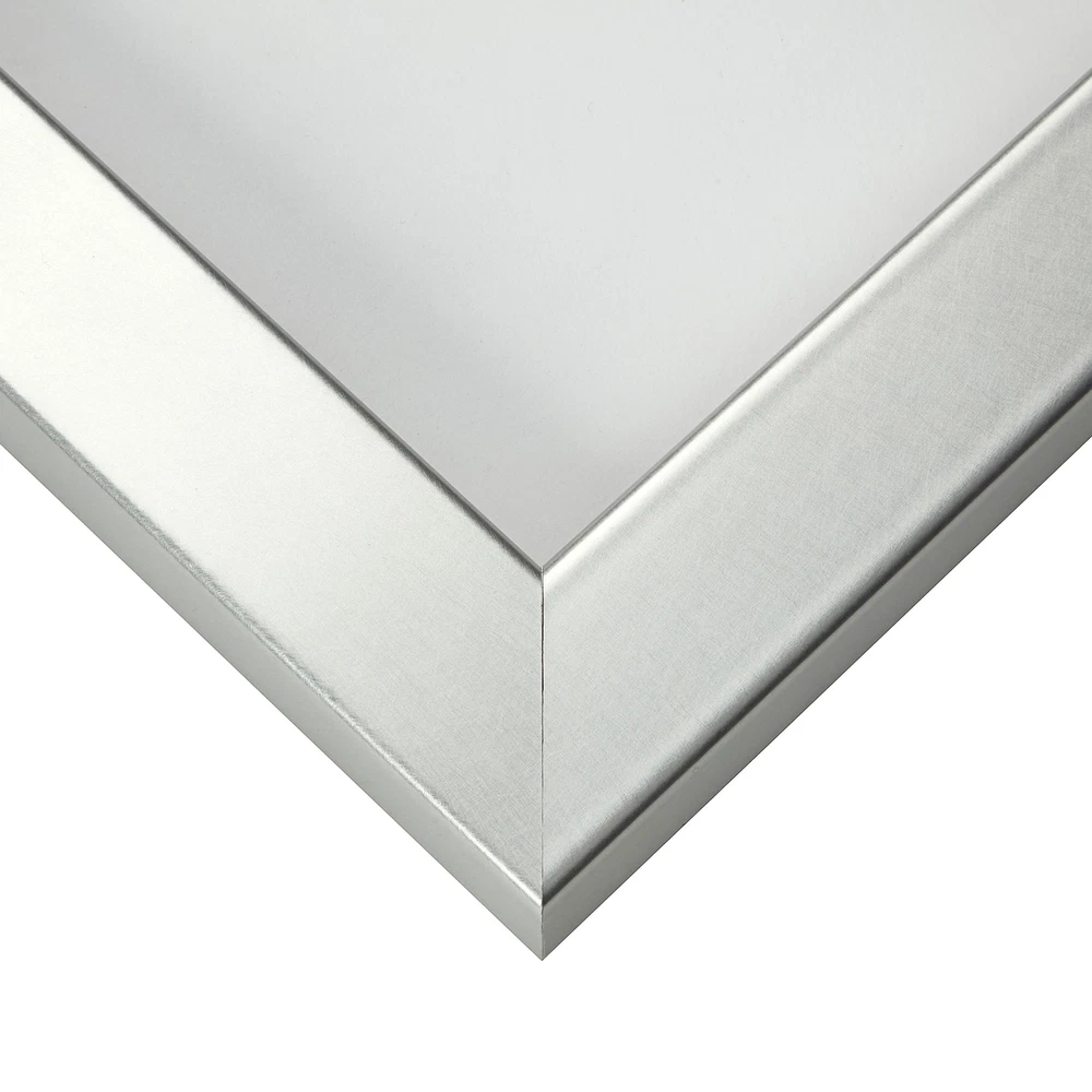With clean rectilinear lines and a square profile, the Bauhaus 125 picture frame is ideal for most modern decor needs. Featuring molding with a composite wood core encased within a laminate wrap, this sleek 1.25 inch wide picture frame molding comes finished in Brushed Silver. With some smooth white matting you can elevate your prints to the next level. Sharp and bold, the Bauhaus 125 Brushed Silver picture frame is the perfect touch of modern. Modern style; brushed silver appearance; smooth laminate wrap finish (NOT ACTUAL METAL) Frame includes: glass, rigid black backing and pre-attached stamped hanging hardware Frame holds a 4 by 10-Inch photo/print/poster (viewable area reduced by .25 inches on each side due to frame lip) Frame moulding is 1.25 inches wide; solid MDF construction Frame is designed for WALL HANGING only (hanging hardware allows for portrait or landscape orientation)