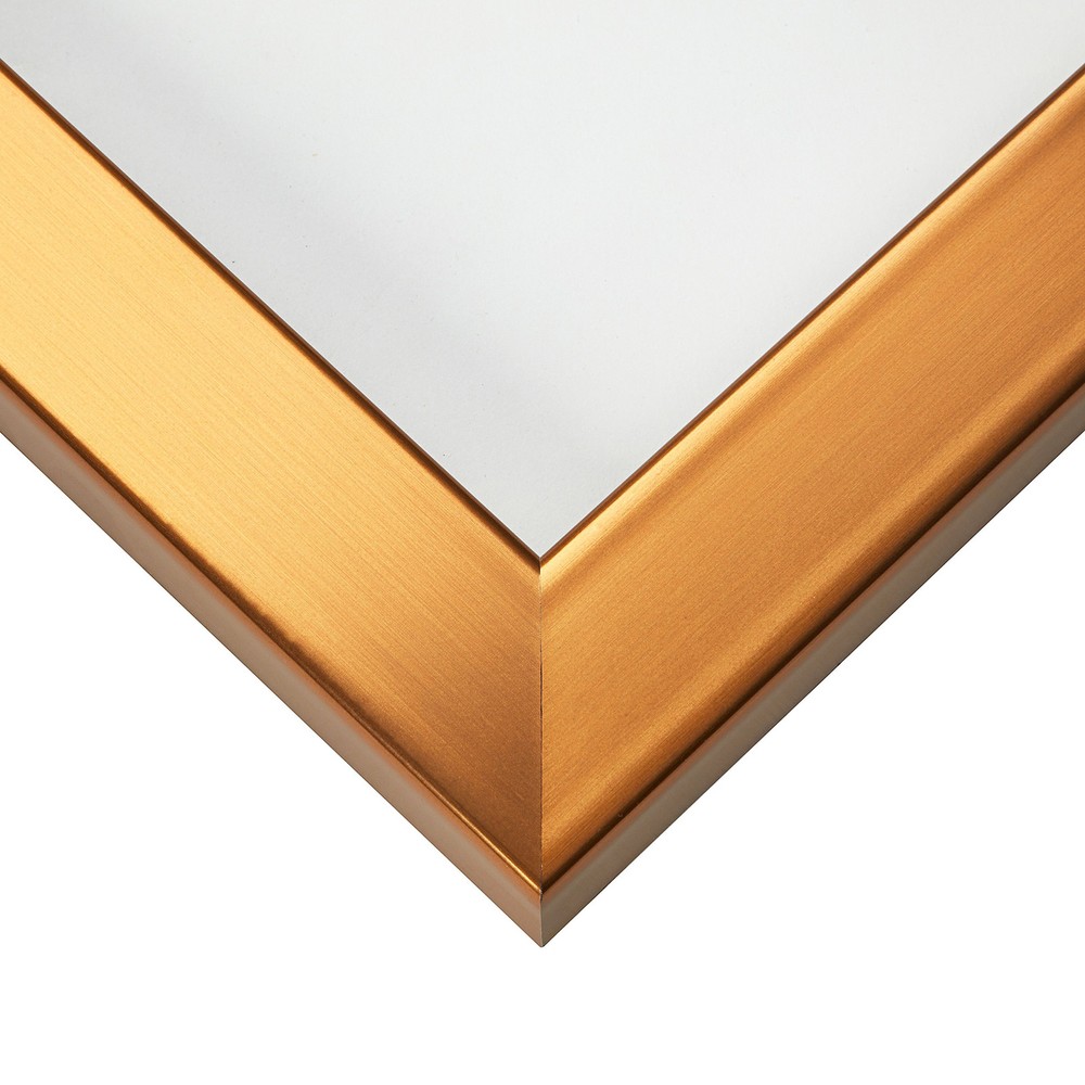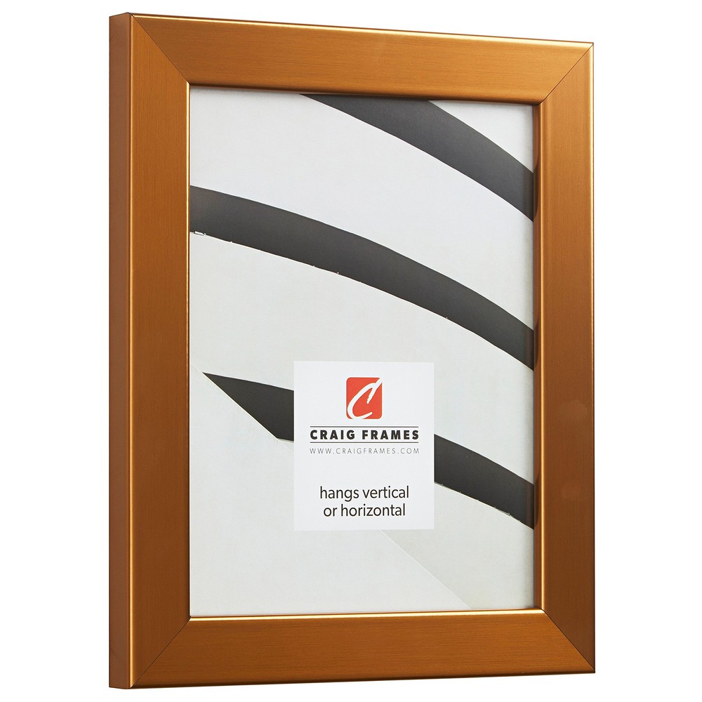 Modern style; stainless brass with copper tones; smooth laminate wrap finish (NOT ACTUAL METAL) Frame includes: glass, rigid black backing and pre-attached stamped hanging hardware Frame holds a 8 by 10-Inch photo/print/poster (viewable area reduced by .25 inches on each side due to frame lip) Frame moulding is 1.25 inches wide; solid MDF construction Frame is designed for WALL HANGING only (hanging hardware allows for portrait or landscape orientation)