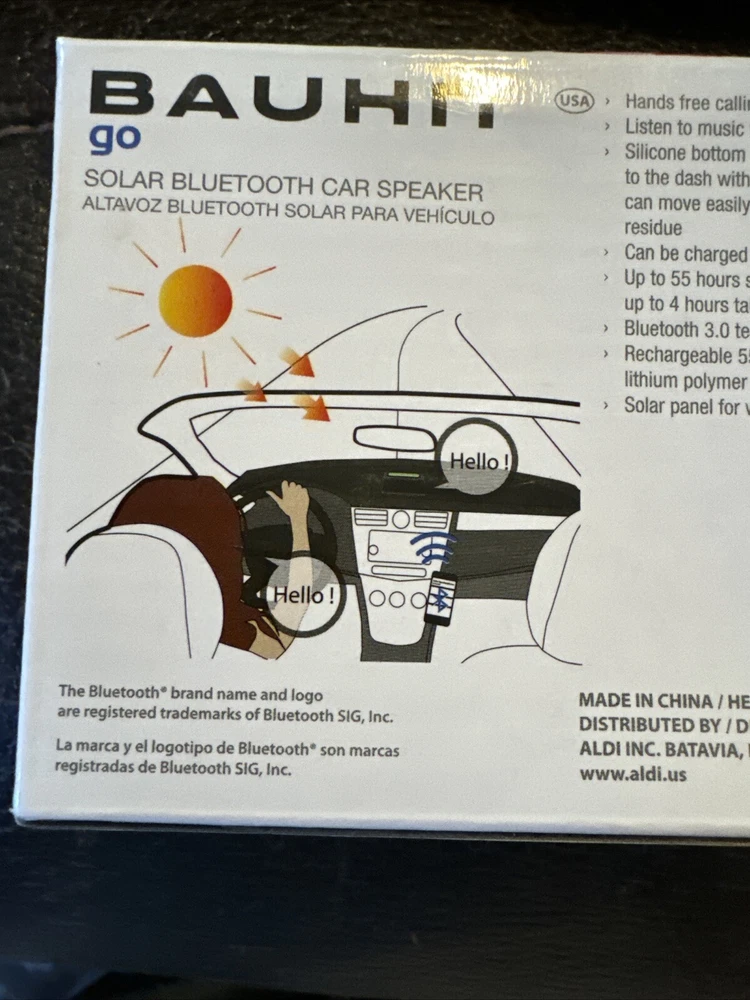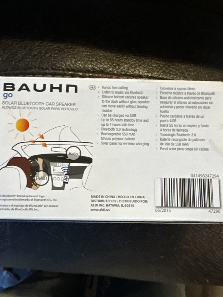 This is a new Bauhn Go solar Bluetooth car speaker. It features a solar panel that allows you to charge the speaker using solar energy. The speaker is designed to be portable and easy to use, making it perfect for outdoor activities or travel. With its Bluetooth connectivity, you can easily connect the speaker to your device and enjoy your favorite music on the go. The speaker also includes a variety of features, such as a built-in microphone and hands-free calling, that make it a versatile and convenient accessory for any driver.