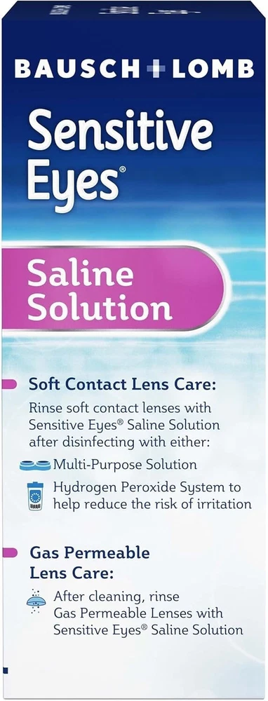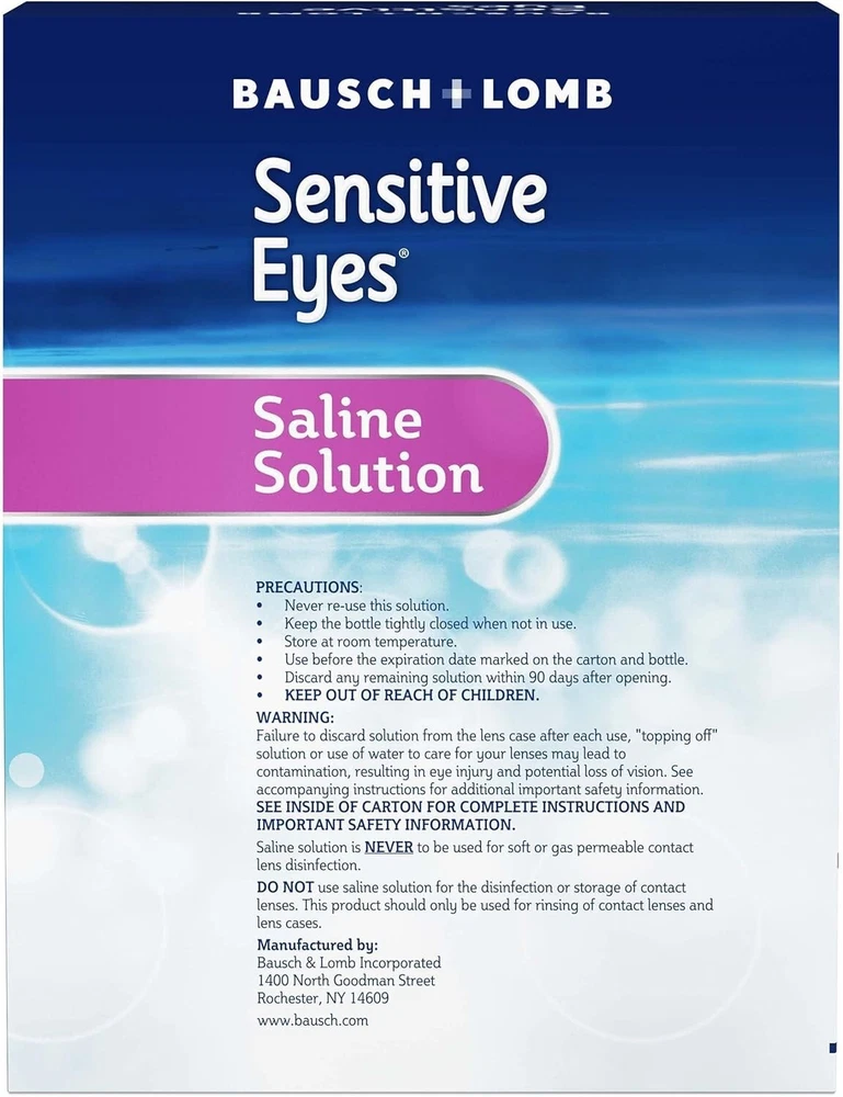 Product Description Pack of two, 12 fluid ounce (Total of 24 fluid ounce). From the manufacturer Sensitive Eyes Saline Solution Bausch + Lomb Sensitive Eyes saline solution removes loosened debris and traces of daily cleaner when used as a rinse after cleaning. It can also be used to rinse lens cases and as a final (pre-inserting) lens rinse after chemical (not heat) and hydrogen peroxide disinfection. Rinsing After Cleaning After cleaning, rinse lenses thoroughly with Sensitive Eyes Saline Solution by holding the lens between the forefinger and thumb or placing it in the palm of the hand. Direct a steady stream of Sensitive Eyes Saline Solution onto each side of the lens for 5 seconds, or until all traces of the cleaner are removed. Rinsing After Chemical Disinfection (Including hydrogen peroxide systems) Clean, rinse and disinfect your lenses as directed by your eye care practitioner. Before inserting your lenses, rinse them thoroughly with Sensitive Eyes Saline Solution.