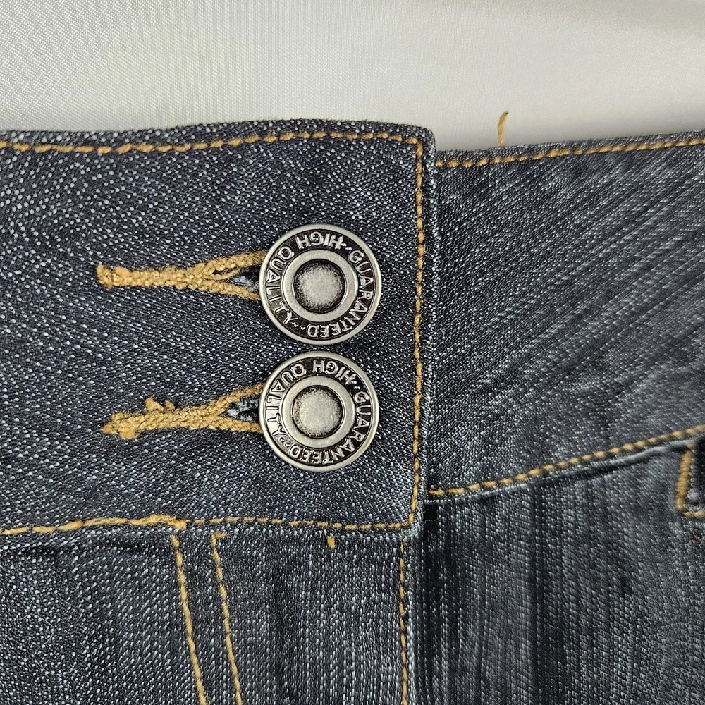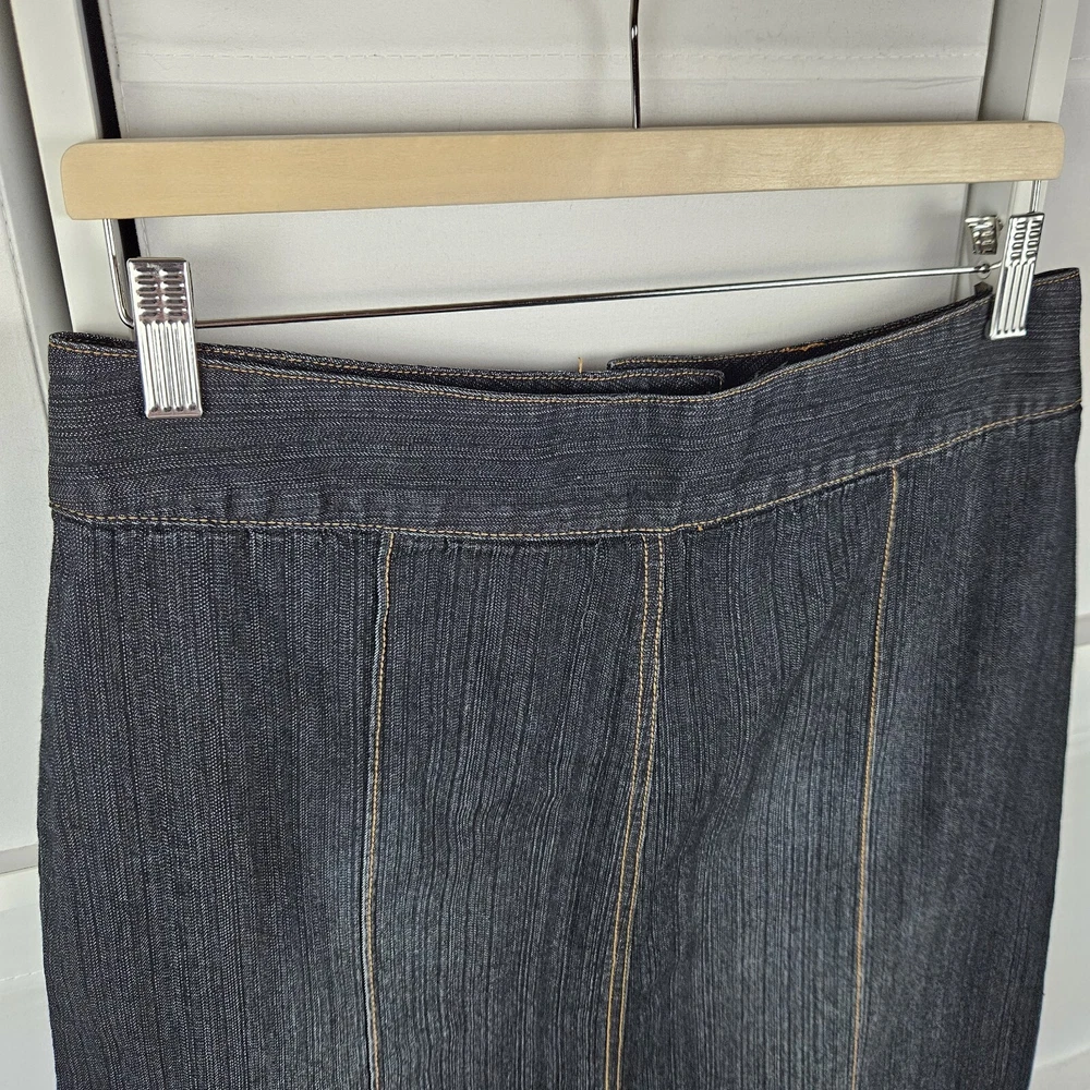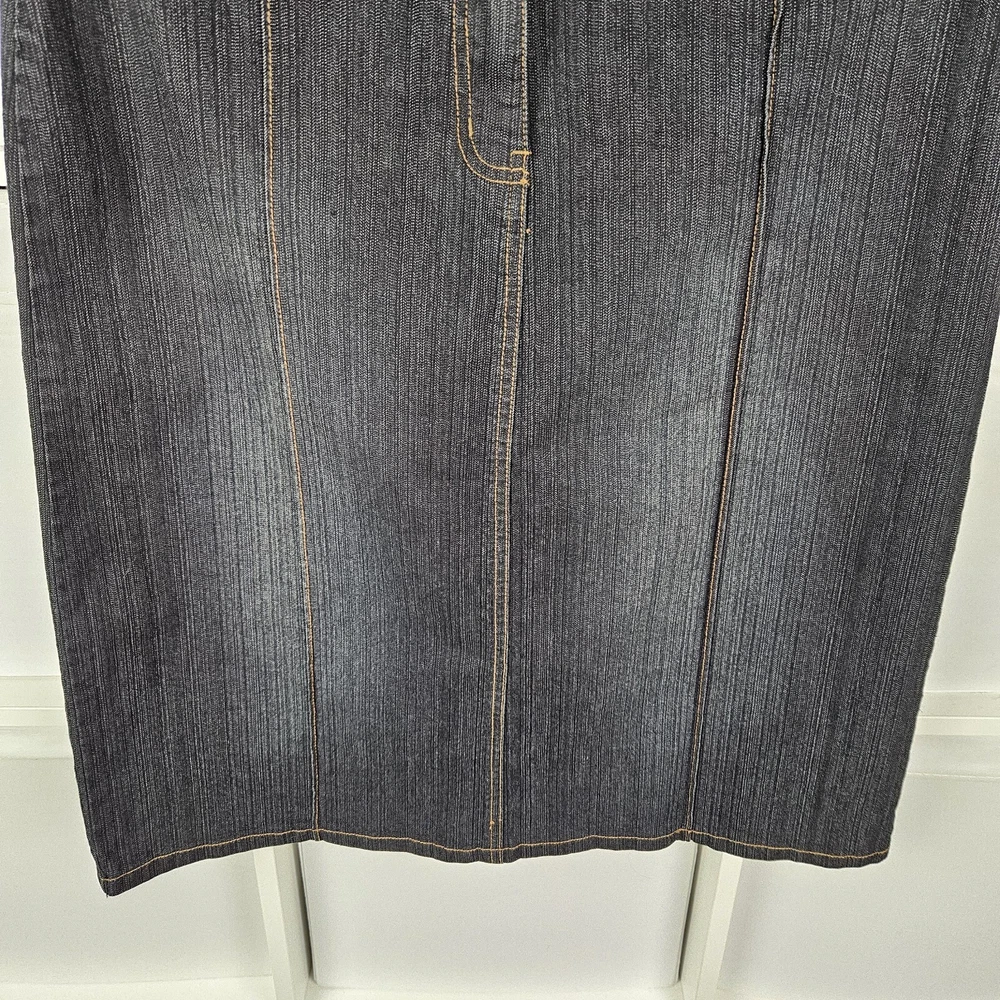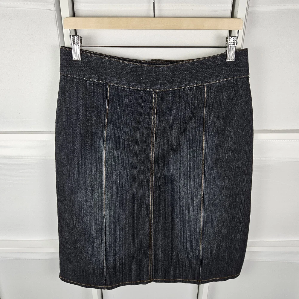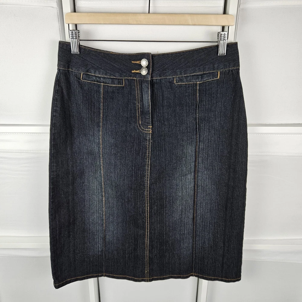 Bay Trading denim skirt, size 12. Dark blue colour. A-line, pencil style. Knee length. Panelled design. Vintage Y2K skirt. In very good used condition. Approximate Measurements in inches: Waist: 15.5 Length: 25