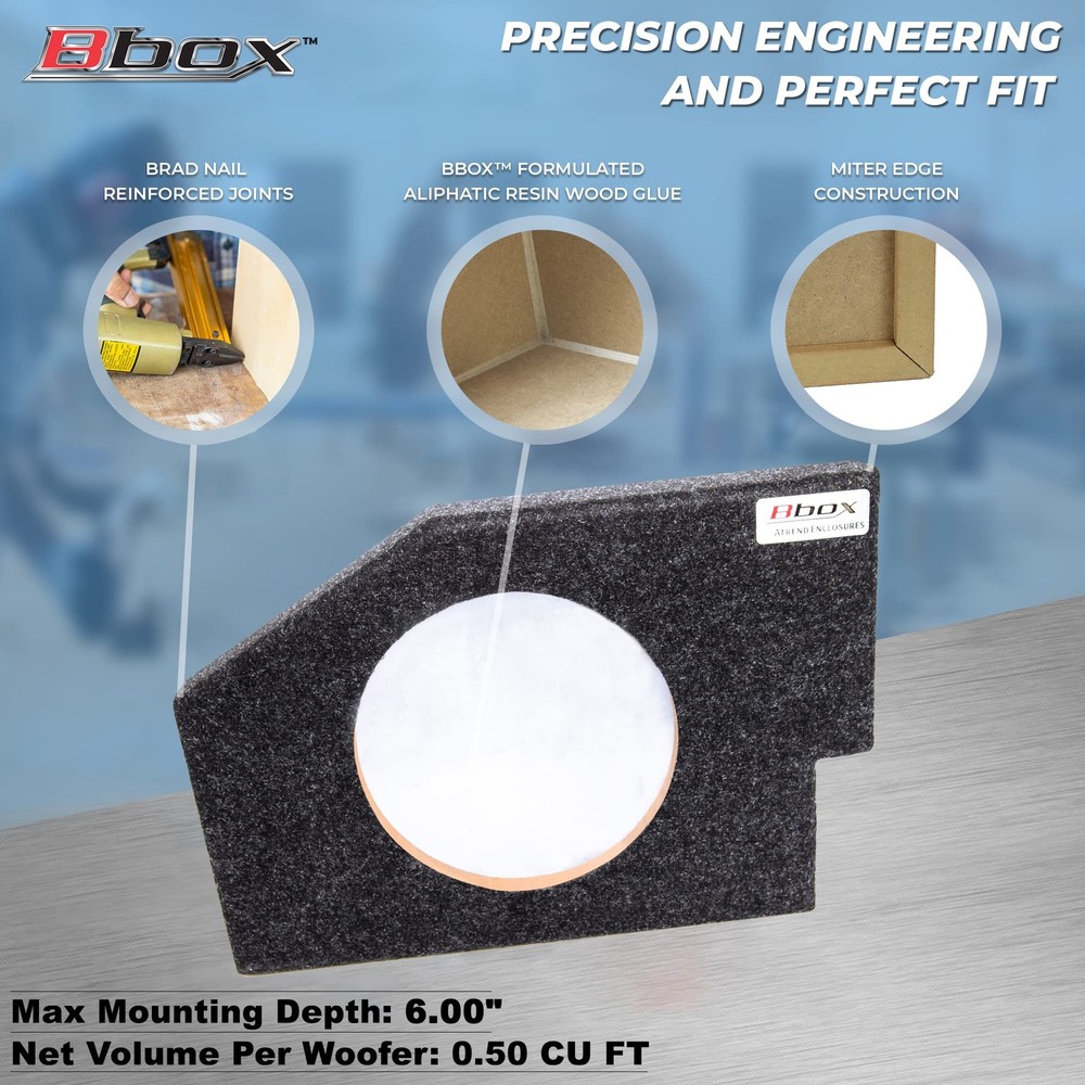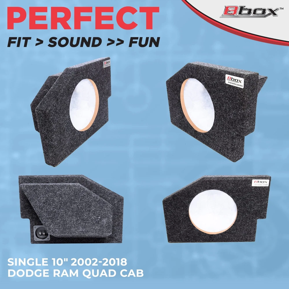 DUAL 10 INCH SUBWOOFER ENCLOSURE: Our Bbox 10 Inch Subwoofer Box is designed for optimum bass response and low frequency reproduction which is ideal for lower profile sound quality subwoofers. Feel, hear, and experience the difference today. Our subwoofer enclosures turn your vehical into a music machine! Dramatically improve the audio quality and bass response of your truck’s subwoofer system and listen to the music the way it was meant to be heard! OEM-FIT: OEM-Fit is designed and engineered specifically for the 2002-2017 Dodge Ram Quad Cab trucks to ensure an OEM fit with out impeding the operation of the back seat. The subwoofer mounting depth is ideal for low profile subwoofers. All our vehicle-specific enclosures are built with a near perfect factory fit in mind. HIGH GRADE MDF: Our subwoofer box enclosure is built with a durable high-grade MDF that is 3/4 inches thick for solid frequency response and accurate music reproduction. The thick MDF panels and no flex construction on our 10 inch subwoofer box allows for tight and accurate bass reproduction. AIRTIGHT RECESSED SIDE PANELS: By using premium materials and aliphatic resin wood glue, the solid construction of our subwoofer boxes are airtight and resonant free. This greatly reduces rattles and improves the overall sound quality of your sound system. ENCLOSURE DIMENSIONS: Since your subwoofer box or enclosure most likely goes into the boot of your car, checking their dimensions is highly important. OEM Grade Rugged Liner is a spray liner finish designed to take a beating and helps seal seamsand prevent air leaks. Product Dimensions Sub cut out: 9.125”, mounting depth: 6”, height: 7.25”, width: 20.25”, depth: 13.25”
