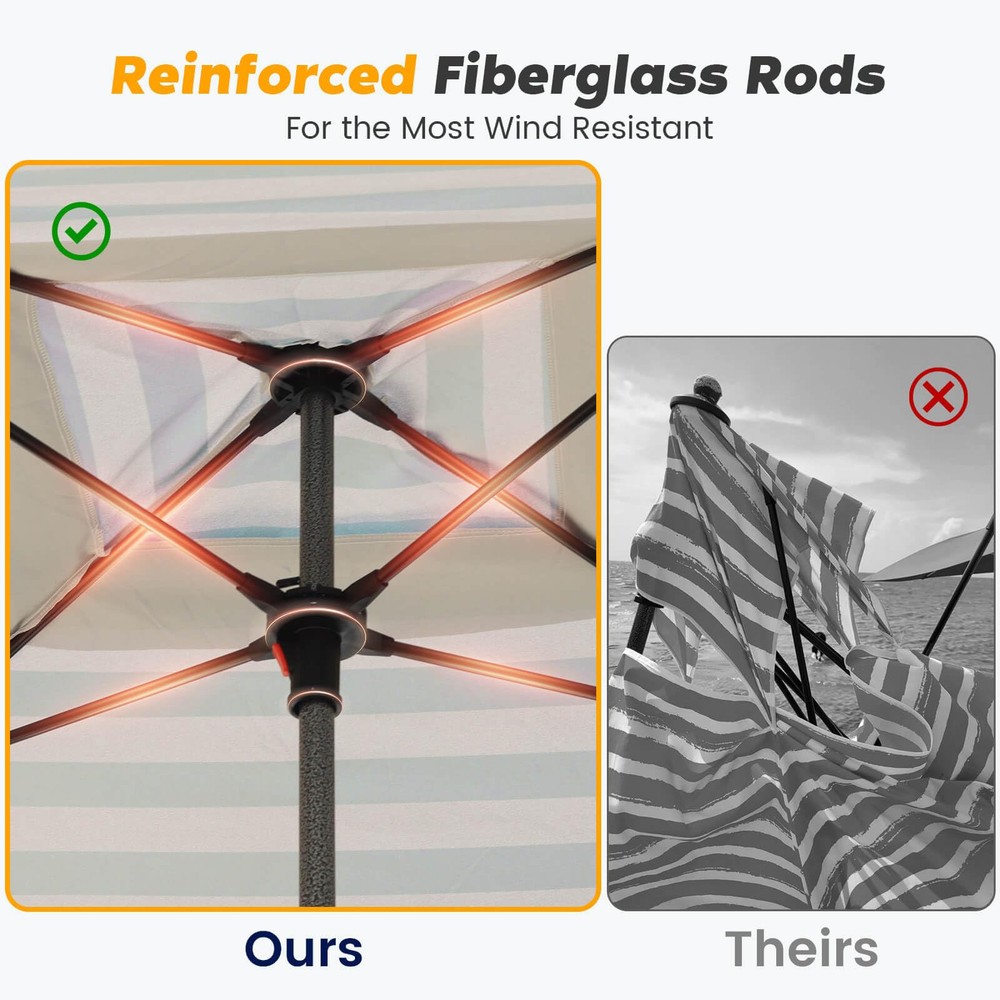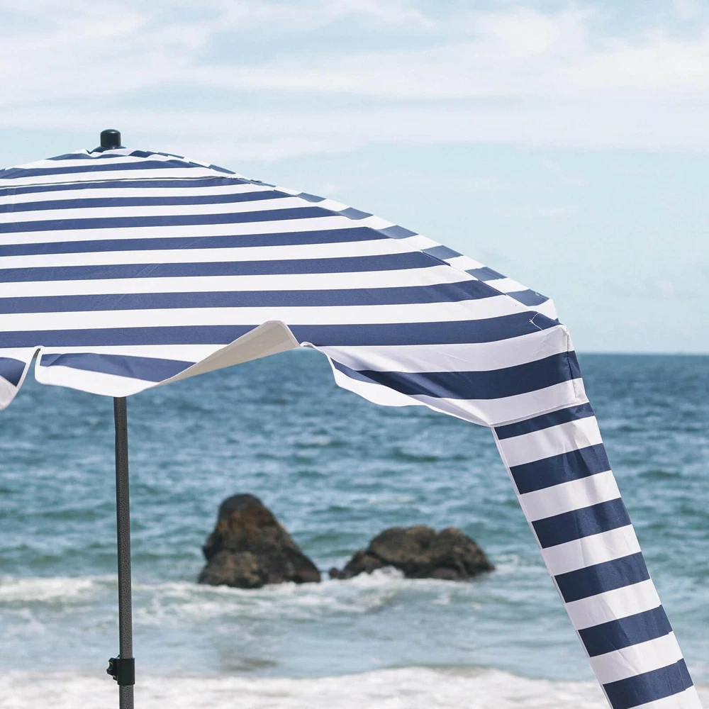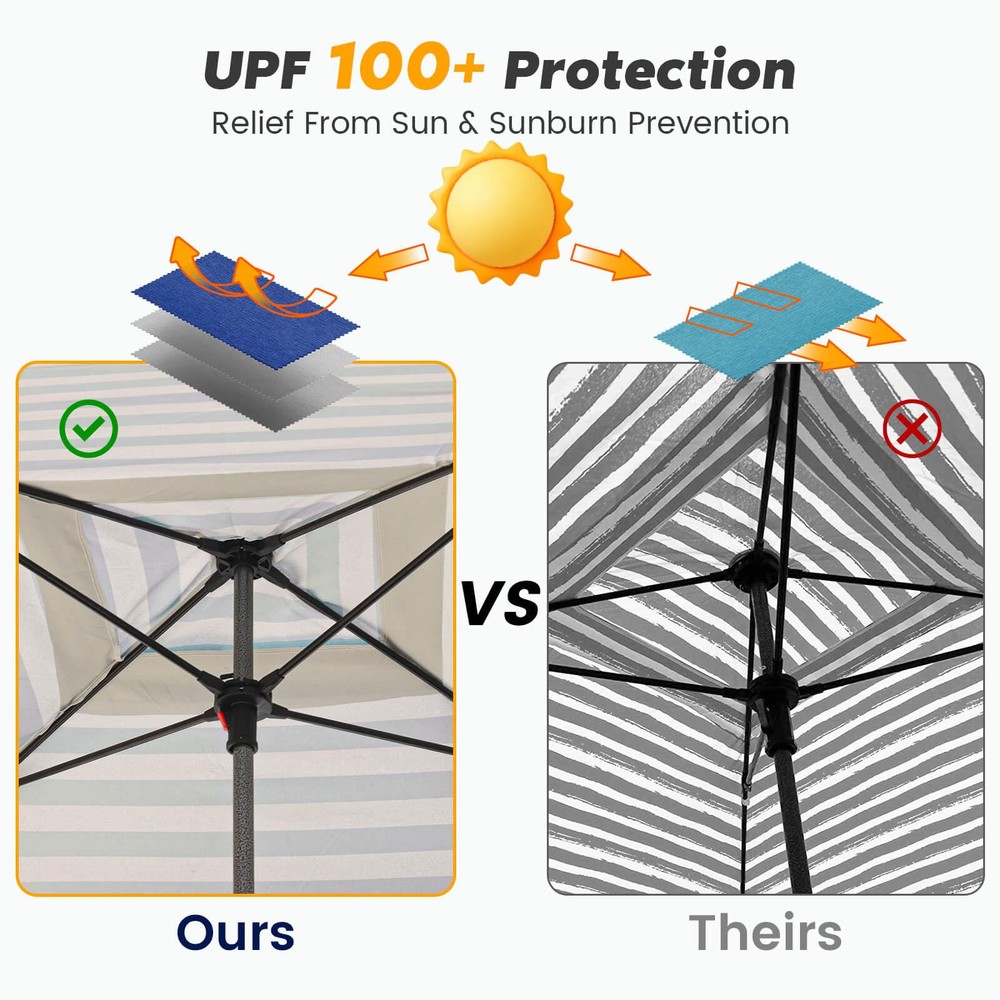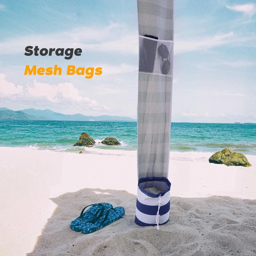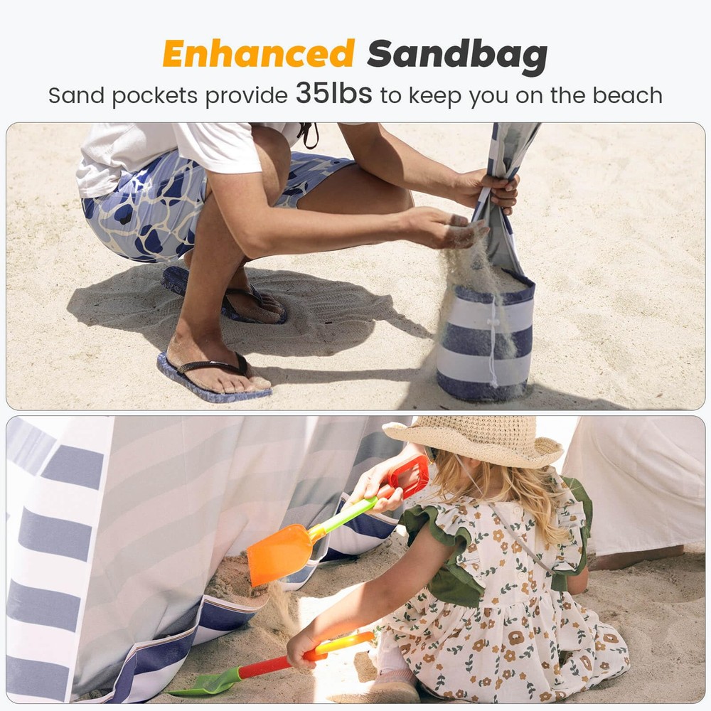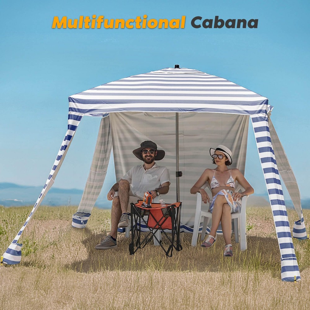 UV Protection: Stay protected from the sun's harmful rays with the beach canopy's UPF 100+ UV protection, making it ideal for beach trips, picnics, and other outdoor activities Sturdy Structure: The beach tent sun shelter features a durable fiberglass structure that securely holds the roof, along with four included stakes and built-in sandbags for easy fixture on all surfaces Easy Setup & Take Down: Effortlessly set up and take down the cool cabana beach tent with its simple two-part design – the beach umbrella and the extension pole, all packed neatly in the carrying bag Attachable Wall for Extra Shade: Enjoy full shade under the cabana's roof with the included removable wall, made from the same high-quality, UPF 100+ UV protection, waterproof fabric as the cabana Convenient Corner Pockets: Keep your essentials organized with inside pockets on each corner of the beach umbrellas for sand , perfect for storing sunscreen, phones, water bottles, and other small items