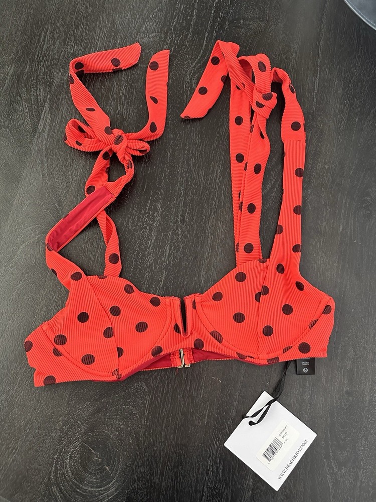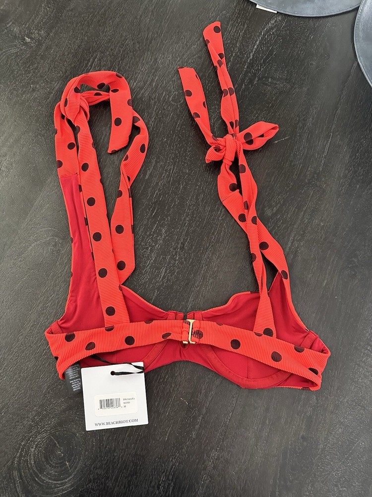 Introducing the Beach Riot Blaire Swim Top in Scarlet Polka Dots, size M. This stylish top is perfect for any beach or pool day, with its beachy theme and colorful accents. The ruffle detailing adds a playful touch to the classic polka dot pattern, making it a must-have addition to any swimwear collection. Made by the popular brand Beach Riot, this top is designed for regular size women and features a comfortable fit. The red color adds a pop of color to any outfit, making it a versatile piece that can be paired with shorts, skirts, or jeans. Don't miss out on the chance to add this fun and fashionable top to your wardrobe. New with tags