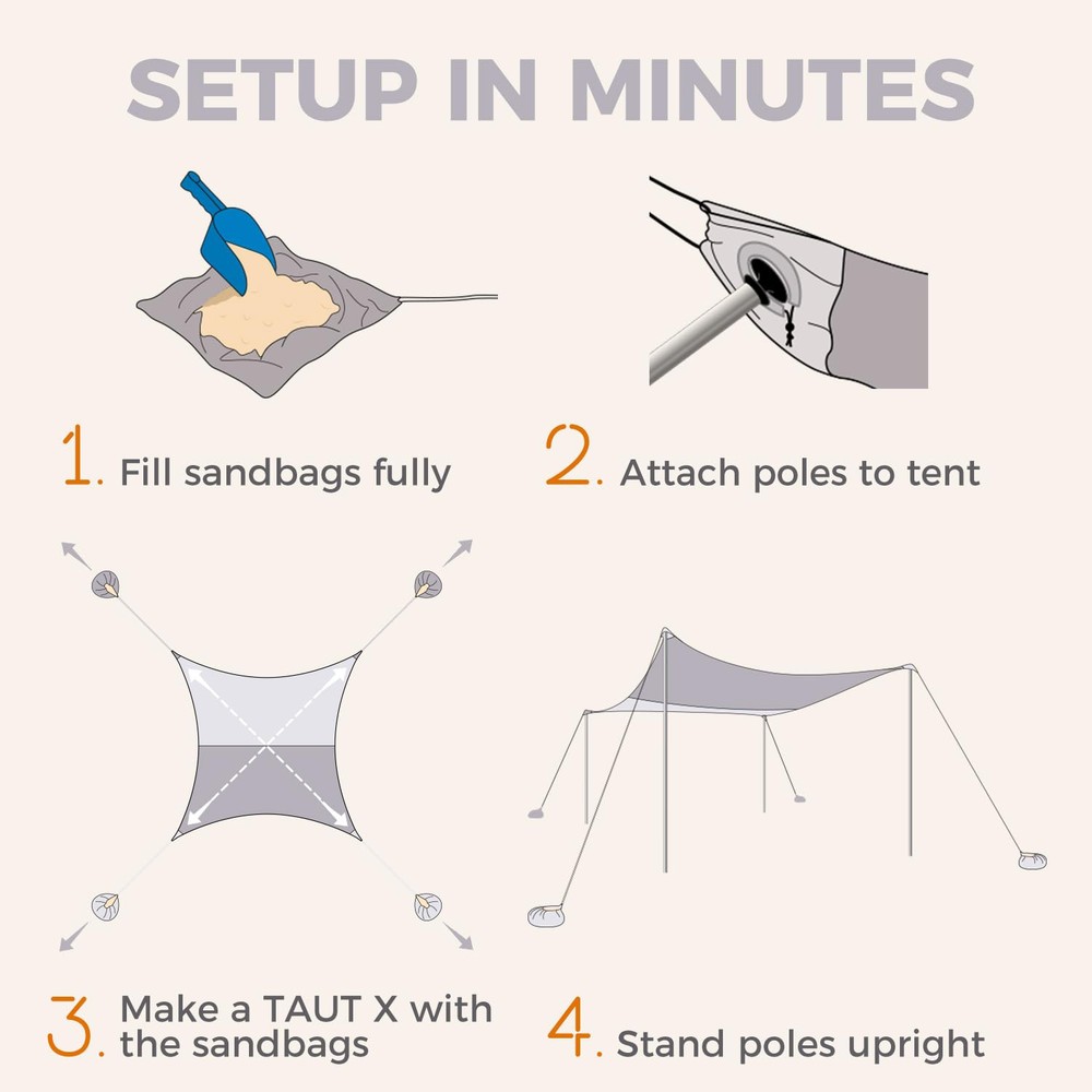 SIMPLE & STRESS-FREE BEACH SHADE SETUP: Forget complicated instructions! Our unique beach canopy design makes assembly a breeze. Simply connect poles to corners with built-in bungee cord, fill sand bags, stretch canopy fabric and stand poles upright - no more guesswork or frustration! BUILT TO WITHSTAND THE WIND: Say goodbye to flimsy beach canopies! Reinforced square corners and sturdy poles ensure your beach shade stands strong, even in windy conditions. Enjoy lasting fun under the sun for years to come. STABLE & WINDPROOF DESIGN: Flapping is a thing of the past! Our aerodynamic canopy top eliminates wind catches, while extra-large sandbags provide unbeatable stability. Relax and enjoy your beach or park time with confidence. SPACIOUS & EXTRA-STABLE: beach tent stands out from the crowd with its sturdy design and breezy interior! Thicker, stronger and higher aluminum poles offer superior stability and create a generous interior for you and your loved ones. PREMIUM SUN PROTECTION: Stay cool and safe under the beach shade canopy! Our UPF 50+ water-resistant fabric shields you from harmful UV rays, perfect for worry-free beach days with family and friends. UNPARALLELED CUSTOMER CARE: We go beyond the sale! Our dedicated team is always here to answer questions, assist with purchase decisions, and offer post-purchase support. Enjoy peace of mind and outdoor adventures with .