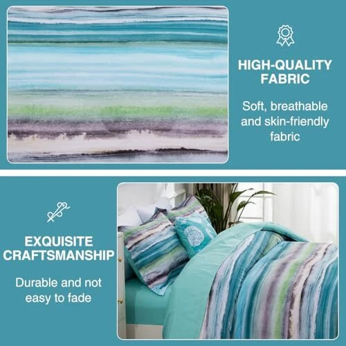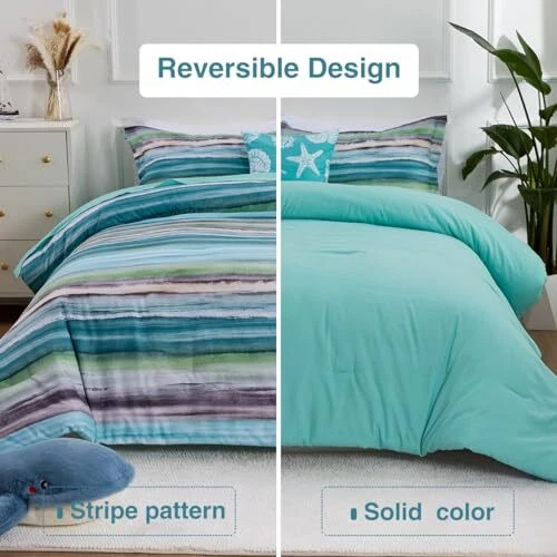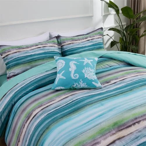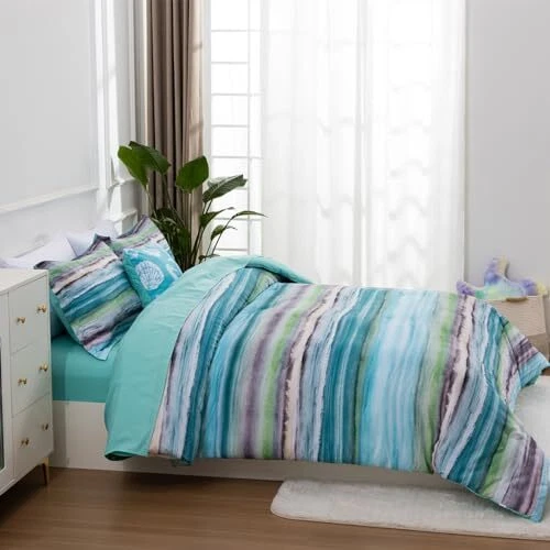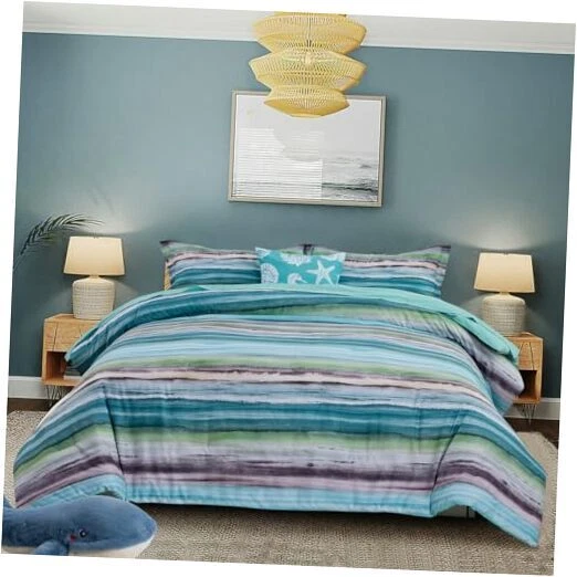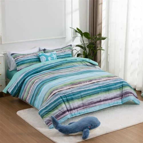 Return Policy Fast Delivery Trusted seller Beach Stripe Bedding Sets 6 Pieces, Aqua Coastal Striped Comforter Set Queen Size All Season Geometric Bed Set, Nautical Bed in a Bag with Comforter, Sheets and Shams Product Description What You Get: The queen comforter set complete set includes 1 comforter (90" x 90"), 2 pillow sham (20" x 26"), 1 fitted Sheet (60" x 80" + 14"), 1 flat sheet (90" x 102"), 1 decorative pillowcase (17" x 17"). Unique design: The stripe comforter set provides a modern take on the coastal stripe. It's watercolor motif, accented with shades of aqua, green and grey, provides the calming feel of the ocean in your space. The decorative pillowcase is printed with seashell, starfish, coral to complete the whole nautical coastal bed set. Comfortable Puff: Made with brushed microfiber, down alternative comforter twin is soft, hypoallergenic, warm and snugly comfy. Superior Craftsmanship: This stripe bed-in-a-bag set showcases excellent workmanship with tight stitching to prevent filler shifting or clumping, ensuring year-round comfort. Easy care- Machine wash cold, gentle cycle, and separately. Do not bleach. Tumble dry low, remove promptly. Do not iron. Shipping Returns Payment Shipping Shipping is FREE to all addresses other than APO/PO boxes in the lower 48 states. All our stock ships from US-based warehouses. Shipped via USPS or UPS (depending on location and package weight) Unless stated otherwise, all orders will ship within 24-72 hours of your payment being processed. Check our feedback to see the great reviews of FAST shipping we offer. Returns Seller does not accept returns Payment We currently accept payment via eBay managed payments only. Once payment is cleared, we will dispatch your shipment within 1-3 business days. Please refer to the "Shipping" tab for more information regarding shipping speed to your destination.