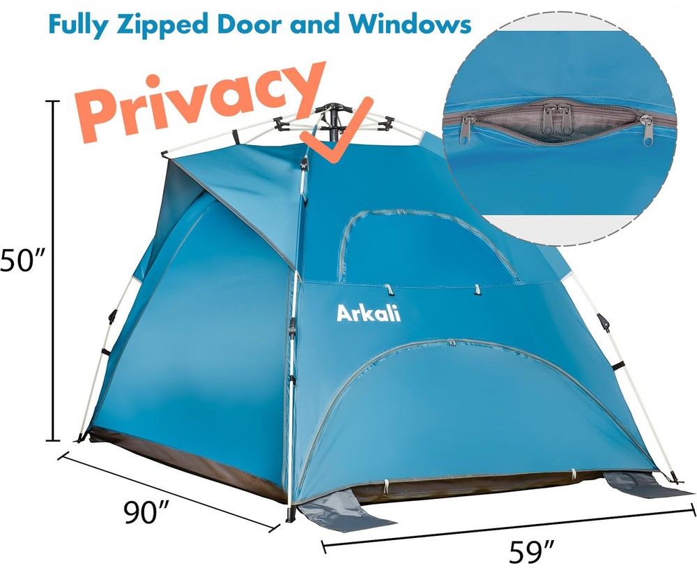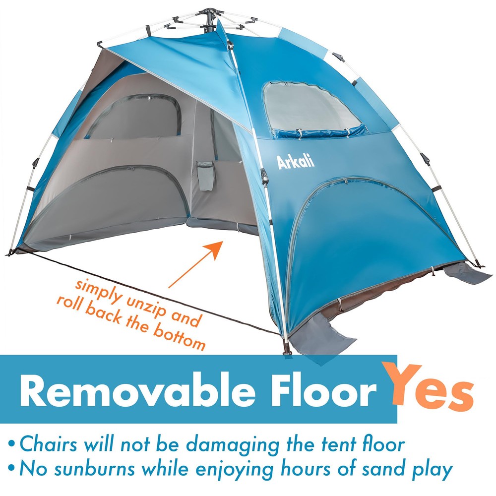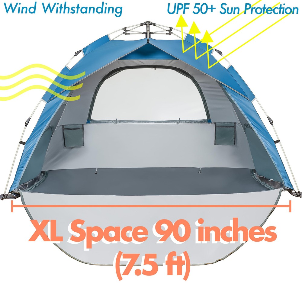 Sun protection: sun shade pop up and UV Guard fabrics Floor-less: no sunburn while enjoying hours of sand play and beach chairs will not be damaging the floor of this pop up beach tent sun shelter Privacy option: door and windows can be fully zipped up to instantly create privacy with this easy pop up beach tent sun shelter Great ventilation: air flow can be easily adjusted by simply unzipping the screens for the flaps and windows Large space: fits a regular family size of 3 to 4 people ; fully opened size L: 90-Inch W: 59-Inch H: 50-Inch Easy setup: sun shade easy pop up, it can be set up or taken down by 1 person