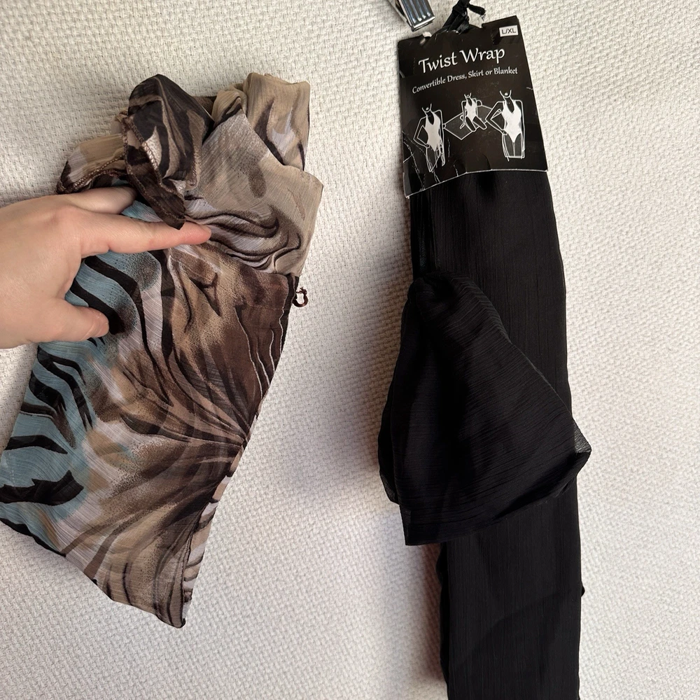 The product is a lot of 4 beach swimsuit cover up sarongs that can be used as a convertible dress, skirt, or blanket. These cover-ups are designed for women in sizes L-2XL and come in a variety of multicolor options. Perfect for a beach theme, these sarongs can be worn in multiple ways to suit different needs and outfits, making them a versatile and stylish addition to any beach wardrobe. See the photographs for all the different ways you can style these two different beach cover-up varieties.