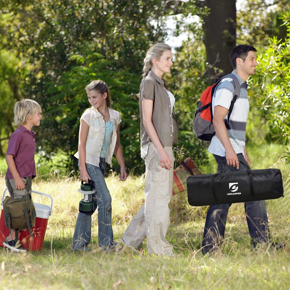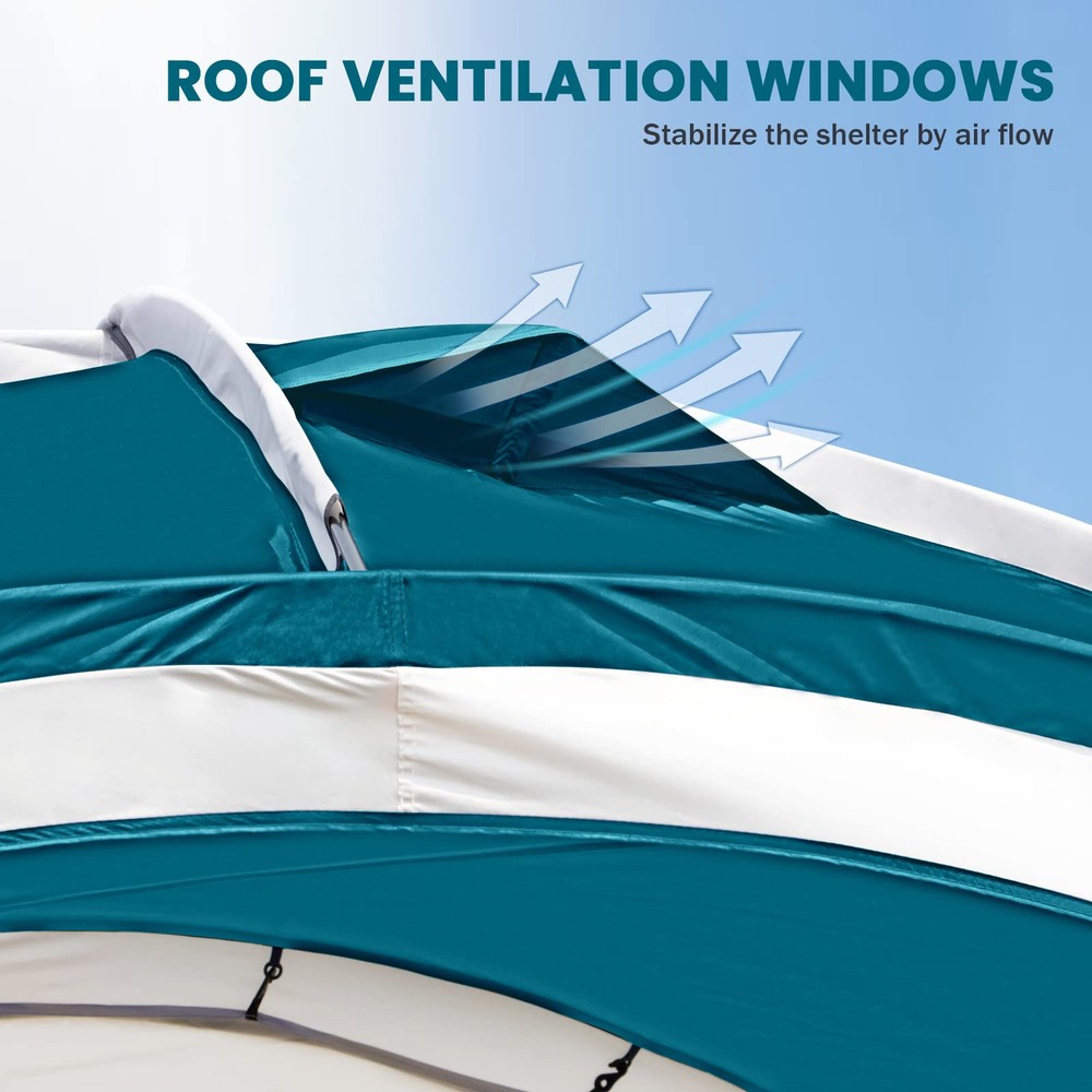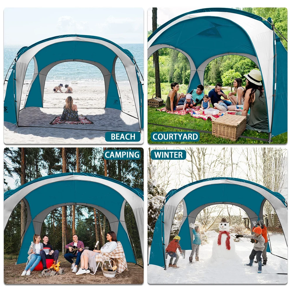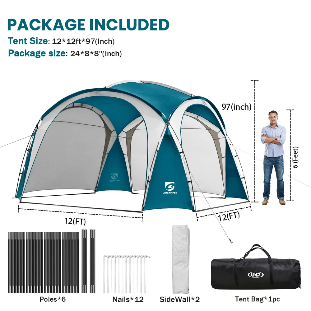 Roomy Shelter: The 12-ft canopy provides 144 square feet of activity space. With a height of 90 inches, it comfortably accommodates 7-10 people Sun Protection: camping tent features UPF 50+ to block harmful UV rays and prevent sunburn. The 195T taffeta with an 800MM coating ensures privacy by making the tent opaque from the outside Cool and Breathable: sun shelter features 4 large doors and comes with 2 sidewalls that can be freely combined. The top ventilation openings ensure continuous airflow Waterproof: camping shelter seams are professionally treated with a PU coating to prevent leaks, ensuring that water does not enter the tent Stable and Windproof: To ensure the tent's stability, we provide 12 ground stakes and 4 guy ropes to secure the canopy, keeping the tent stable even in strong winds Brand Promise: We offer a one-year after-sales guarantee. If you have any issues or need additional accessories, please let us know