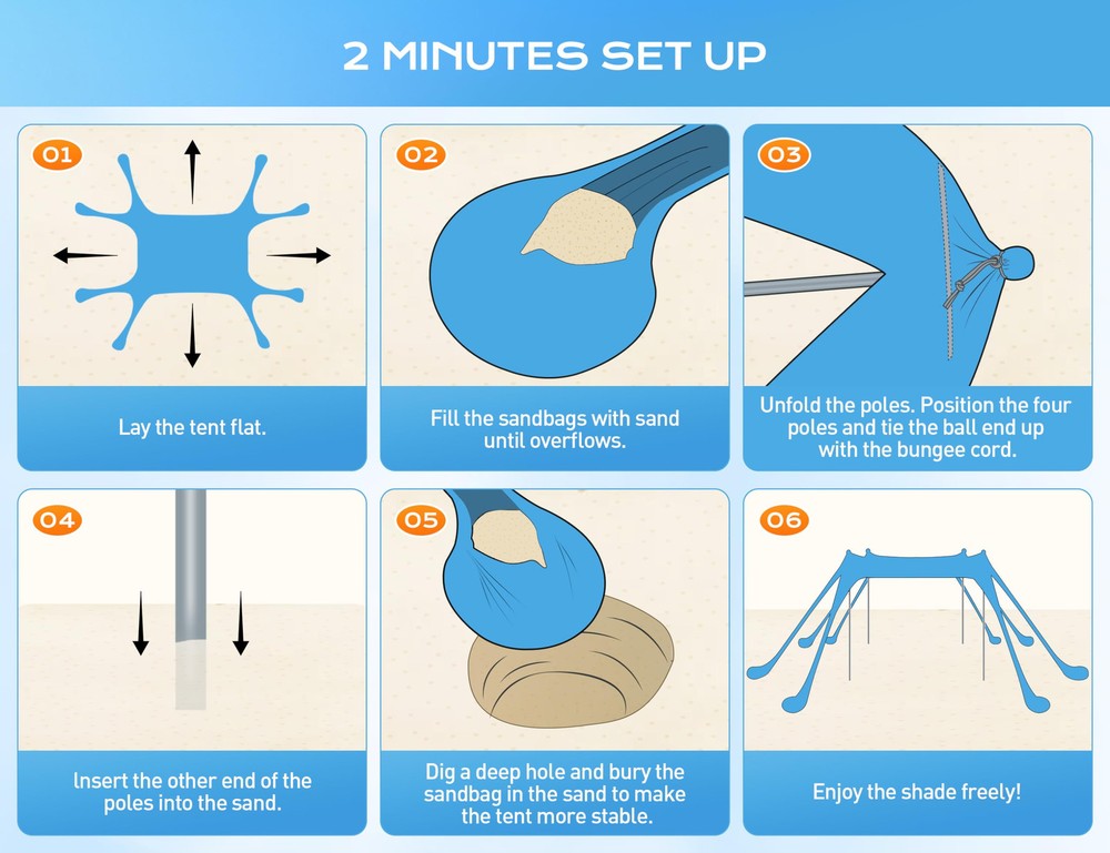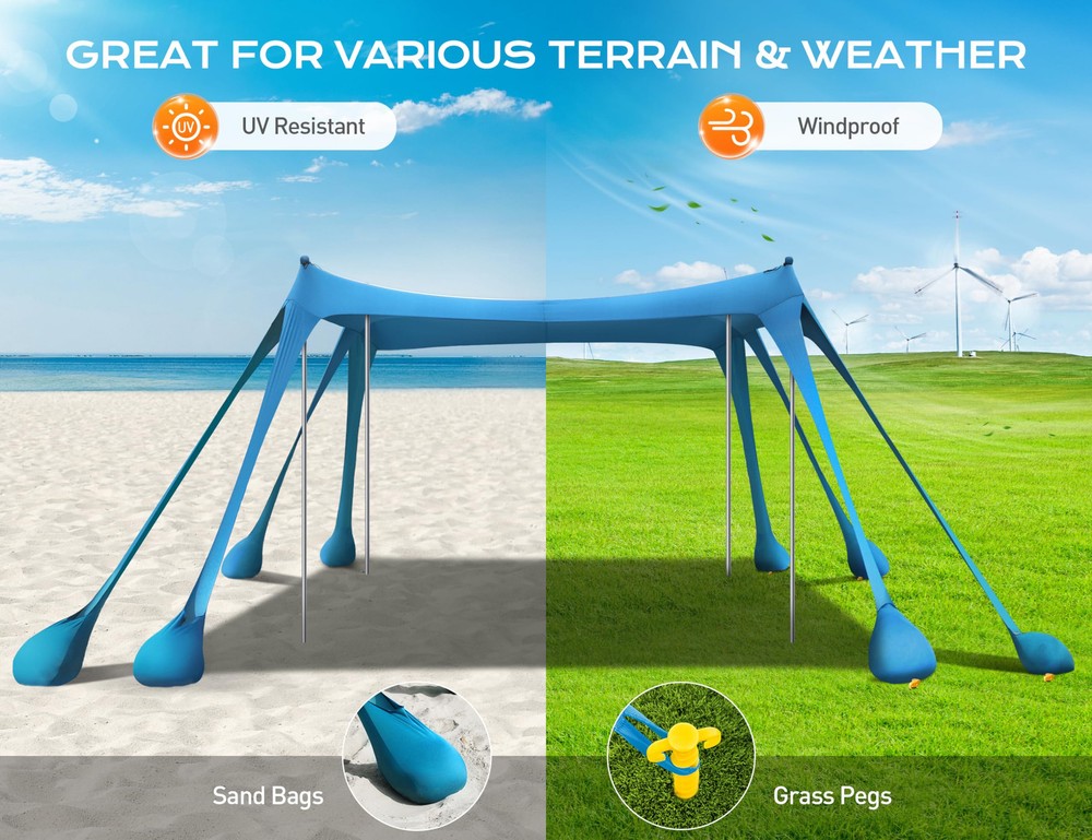 ENHANCED STABILITY & DURABILITY: With exceptional 8 large sandbags and 4 thickened aluminum poles, this windproof beach tent sun shelter offers superior stability, outperforming others by 80%; Made of long-lasting high-stretch Lycra fabric, it stands up to various weather conditions, providing reliable shelter for your outdoor activities; The vibrant sky-blue color adds liveliness, making it a perfect addition to your cool summer adventures SPACIOUS & VERSATILE: Measuring 10x10 feet, the beach shade canopy can comfortably accommodate up to 8 people; The tent provides ample space for you, your family, or friends; Provided with 8 ground stakes, it can be used on both beach and land surfaces; Ideal for park outings, backyard gatherings, camping, fishing adventures, and more SUPERIOR UV PROTECTION: With UPF50+ protection, the beach tent pop up shade reduces over 96% of harmful UV rays; It's a perfect family-friendly shelter, reducing the risk of sunburn and glare during your outdoor fun time LIGHTWEIGHT & PORTABLE: Weighing only 8.3 pounds, this beach canopy tent sun shade comes with a sturdy nylon travel bag, making it convenient to carry or store in the car trunk. Bring sun protection anywhere with ease QUICK & FLEXIBLE SETUP: Set up is fast and simple; Use 2 or 4 support poles to adjust the shape according to the number of people and the angle of the sun; Set up can be completed by one person in just 5 minutes, leaving you more time to relax and enjoy