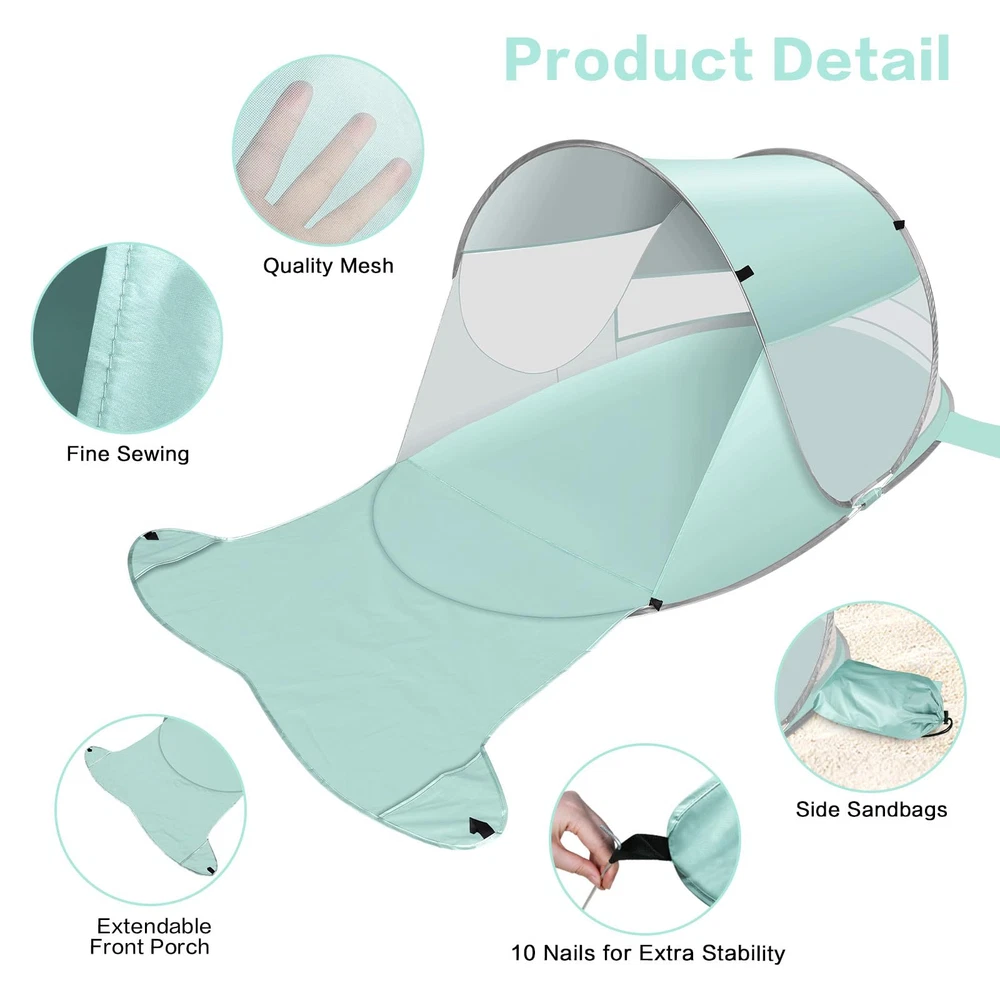Portable & Larger Space: This beach tent is assembled in two parts and extended front floor provides extra space for more activities. The open size of sun shelter is 98 x 47 x 37 inches (L x W x H), comfortably fits 3—4 people. Lightweight at 4 lbs, packs down to 24" x 1" inches, easy to take down and fold back under 30 seconds, no need spending time & energy to build it up. pop up tent is the best choice to travel with. 360° Ventilation: Three large mesh windows with spacious entrance are enlarged to help air flow and widen your vision, allowing you to enjoy the sea breeze and playtime comfortably inside the beach shade. Excellent UV Protection: Beach shelter tent with eco-friendly silver coating that can be effectively blocks up to 98% of the sun's harmful UV rays, which providing all-day protection for you and your family. Water/wind-proof design makes it suitable for all your outdoor activities. Premium Material for Stability: The beach canopy sunshade is made of 190T polyester for long lasting performance, strong frame, not easily deformed and cracked, all while supporting the beach shelter tent securely, allowing it to stand by itself and keeps shape after long time use. 4 sand bags and 10 stakes are provided, allowing to form a stable structure with the sun tent, which further enhances the stability. Widely Use: Automatic instant tent is suitable for many occasions, it is not only appropriate to be used at the beach, but also perfect fit any activities at the park, backyard, fishing, playground, playgroups, sporting events, music festivals, weekend trip or children playhouse. The perfect ideas for birthday parties, picnics, carnivals and sleepovers.