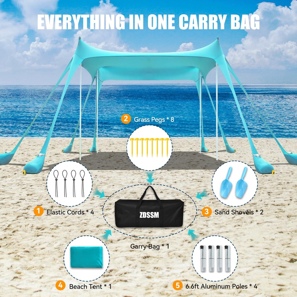 Sun Protection - This beach shade is made of high quality UPF 80+ water-resistant fabric.Can block out harmful UV rays to reduce sun burn or glare. Perfect for kids or adults for beach and outdoor use. Stble - The beach tent will come with 8 tear-resistant sandbags, 4 aluminum poles, sand shovel and ground pegs. More stable for you to use it over beaches or thick grassy areas. Easy to Setup - Our beach shade canopy is very easy to set up. You can complete it on your own in minites. Large Size & Portable - The pop up canopy 11x11 ft can hold up to 8 people for beach parties or outdoor picnics. Packaged with a travel bag to keep it all safe organized and portable. Use Anywhere - This beach canopy tent sun shade is great for friends or families to relax on the beach or enjoy some family time at the park. You can set it up almost anywhere.(Patent No: D980374S)