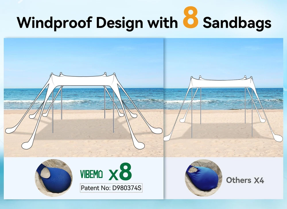 【8 Upgraded Larger Sandbags】: pop up beach tent upgraded to 8 larger sandbags (Patent NO: D980374S) and 4 thickened aluminium poles, making it 80% more stable than other beach tents. 【Quick and Easy Setup with 2 Options】: beach canopy is available in two installation methods: 4-poles or 2-poles and can be installed by a single person in 5 minutes. 【Large Size Beach Tent】: 10 x 10ft outdoor sun shelter can accommodate up to 8 people at a time, it is not only suitable for beaches but also suited for various outdoor scenes such as fishing, park outings, camping, etc. 【UPF 50+ Protection】: beach tent sun shelter is made from high-stretch lycra fabric and offers UPF 50+ sun protection, perfect for beach and outdoor use, protecting children or adults from harmful UV rays to reduce sunburn or glare. 【Light and Portable】: Weighing 8.1lbs and coming with a travel bag that fits in your carry-on luggage or car trunk, you can easily take your pop up shade tent anywhere.
