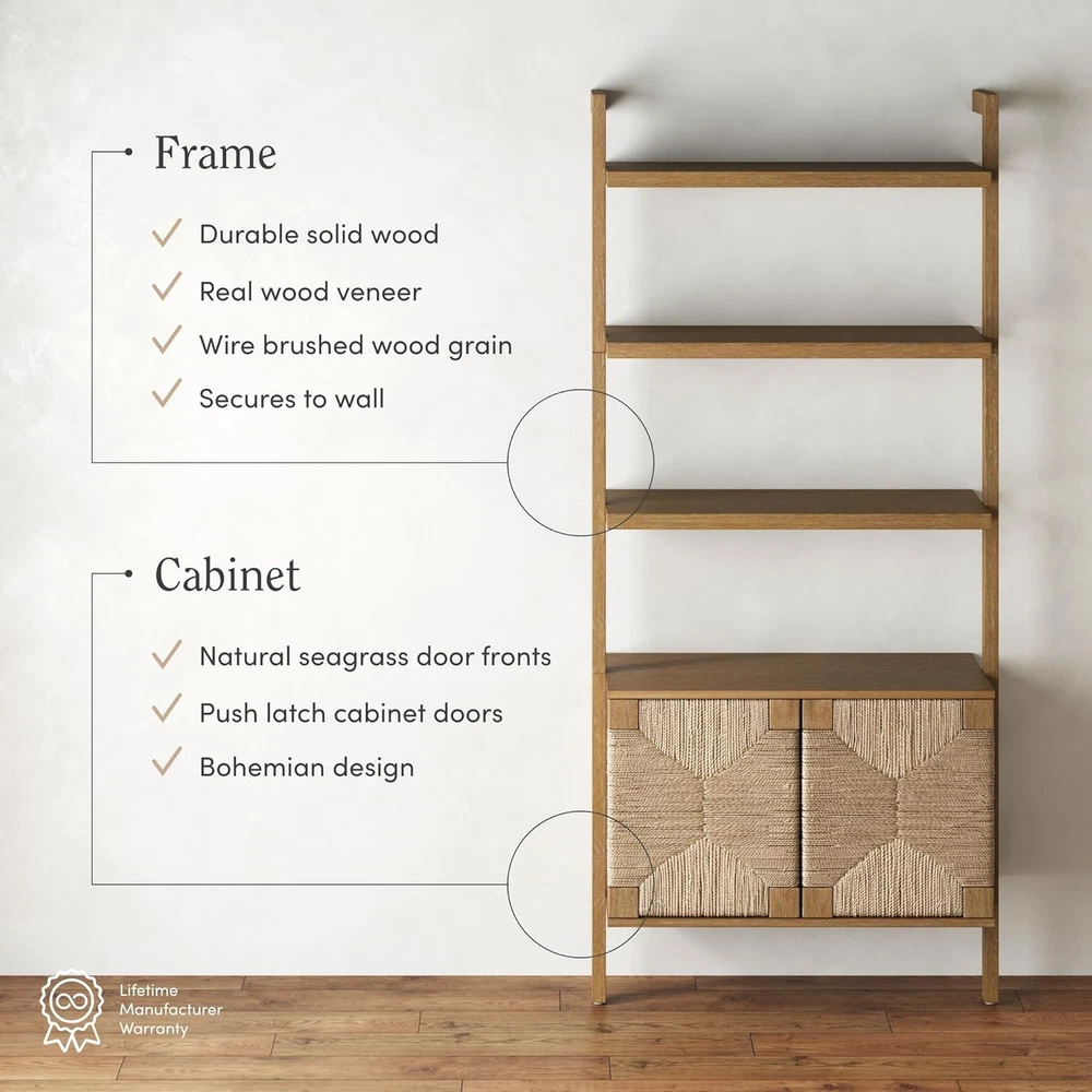 Store New Arrivals Add to Favorite View Feedback Contact Beacon 3-Shelf Solid Wood Bookshelf with Storage Cabinet, Bohemian Wall Mounted Shelf with Seagrass Door Fronts Description Item model number 67601 Style 3-Shelf Number of Items 1 Country of Origin Vietnam Shelf Type Ladder Shelf Shape Rectangular Unit Count 1.0 Count Room Type Office, Living Room, Bedroom, Library, Study Room Weight capacity Maximum weight: 110 Pounds Assembly Required Yes Product Dimensions 14"D x 32"W x 72"H Installation Type Freestanding Material Wood Mounting Type Wall Mount Age Range (Description) Adult Finish Type Brushed Specific Uses For Product Books, Plants, Decorative Items Included Components Hardware Model Name Beacon Bookshelf Back Style Backless Item Weight 60 pounds Number of Shelves 3 Special Feature Space Saving Weight Limit 110 Pounds Color Beacon Light Brown/Seagrass Furniture Finish Wood Recommended Uses For Product Storage, Home Decor Product Care Instructions Wipe with Dry Cloth Size 1 The Beacon bookcase is a bohemian style wall mounted shelf to display your favorite mementos. It features 3 sturdy shelves and a bottom cabinet storage with woven seagrass accents. The enclosed cabinet storage highlights an adjustable shelf that can accommodate up to 20 lbs of weight. Put multiple bookcases together to create a multifunctional space that fits your needs. Easy 80-minute assembly and manufacturer warranty: try for 100 days. Transform your wall into a bohemian sanctuary with the Beacon bookcase - a piece of functional storage and a true style statement. The hand-woven natural seagrass door fronts set the Beacon apart, adding a touch of artisanal charm to your living room or home office. This 3-shelf bookcase with storage cabinet is crafted from durable solid wood and real wood veneer finished with wire-brushed wood grain -- you won't only have a beautiful wall-mounted bookshelf but one that'll surely last for years. Beacon also highlights a roomy interior shelf behind the push latch cabinet doors, so you'll have ample storage space for your essentials while keeping your space organized and clutter-free. Nathan James is the furniture company built for this generation. You don't need to spend a fortune to get quality design-first furniture, and when we say easy assembly, we mean it. ABOUT US We offer the best prices around on high quality products. Our E-store includes media such as books, movies, music and games while offering electronics, toys, sporting apparel, clothing, tools, general home, garden items and more. SHIPPING We are always working hard to ensure your package arrives as soon as possible. Please understand that some factors like weather, high postal traffic, and the performance of shipping companies are outside of our control. We offer free shipping to the lower 48 states and ship within 2 business days of payment, usually sooner. We do not accept P.O. Boxes. Please provide a physical address. For shipping outside of the continental USA, we only use eBay's Global Shipping Program.The item is shipped to KY and then sent to the rest of the world. International customers are responsible for all duties and taxes. Continue to check out in order to calculate costs for shipping the item to your country. Messages regarding eBay's Global Shipping Program MUST be directed at eBay EXCLUSIVELY. RETURNS We offer a 30-Day Return Policy on items which you are not completely satisfied with. You have the option for a full-refund or an exchange of the item. No returns are available on items shipped outside of the USA. PAYMENT We accept PayPal. CONTACT US This page content is yet to come Please ad us to your favorite seller and visit again later Thank You CUSTOMER SATISFACTION We try our very best to make sure every customer is completely satisfied. If there's a problem, message us! We're happy to help. WE ACCEPT Copyright © 2021 AutoDS. | All Rights Reserved