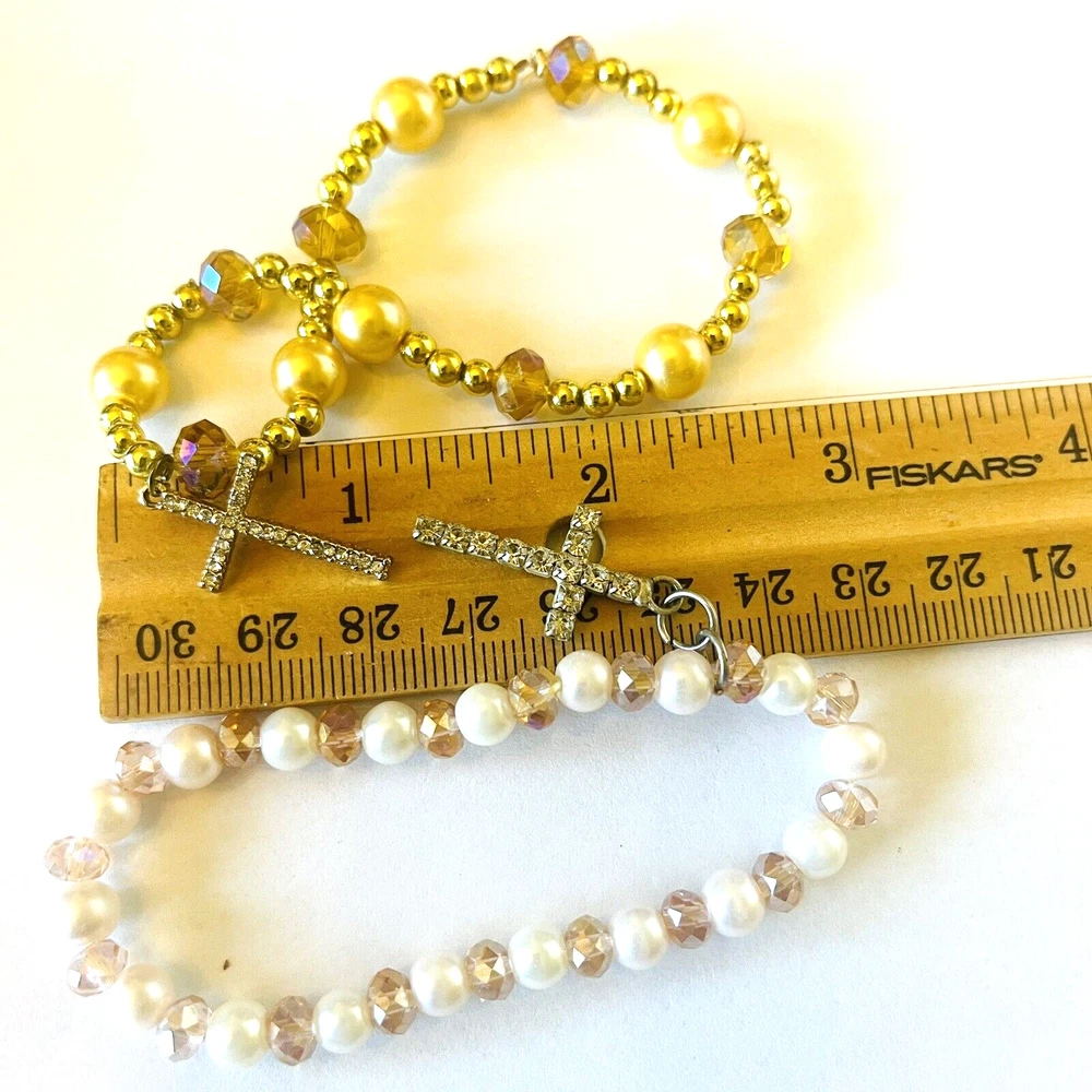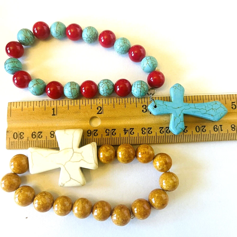 **Contact me to create custom bundles! I will discount multiple item / listing purchases + combine shipping for extra savings!** Collection of 12 bead bracelets that feature cross charms. 10 are elastic stretch bracelets & 2 are silver tone chain. Great lot for bead and charm harvest. Mix of beads include glass, stone, wood, metal, acrylic and plastic. See photos taken with ruler for more detail on size of beads and charms and added description. Beads are in good condition for bead harvest and crafting. Bracelets are wearable but age and condition of elastic varies and can not be trusted. Selling for bead harvest to make jewelry and other crafts. See photos. Zoom for more detail and assessment of condition. Feel free to contact me with questions. I will create custom bundles & give discounts for purchases of more than one item/listing + combine shipping for extra savings. Quotes provided on request. All sales are final. Returns are not accepted; however your satisfaction is important to me. Please reach out if there is a problem with your purchase. Thanks! PassionatelyCollected I passionately collect things.....