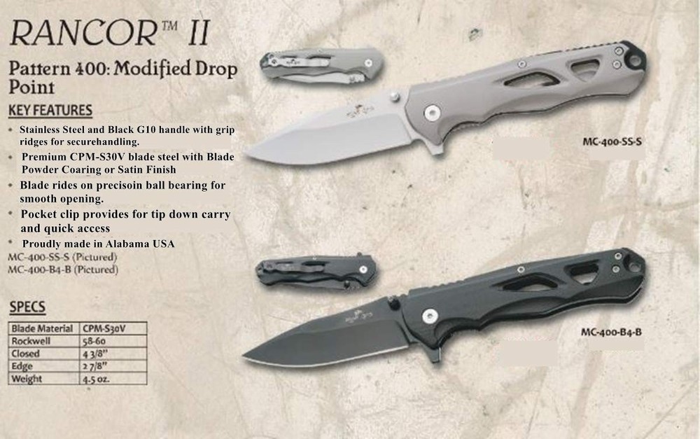 HIGH QUALITY TACTICAL KNIFE - The Bear OPS Rancor II is a high-quality tactical folding knife that features a sharp CPM-S30V steel blade, pocket clip for tip down carry, and textured G10 handle for a firm grip and easy one-hand opening. RAZOR SHARP CPM-S30V BLADE - CPM-S30V steel is a high-quality steel known for its hardness and ease of sharpening. The modified drop point blade has a thickness of .115” and a hardness of 58-60 HRC ensuring a lost lasting edge that is easy to sharpen. COMPACT AND LIGHTWEIGHT – With a closed length of 4-3/8", edge length of 2-7/8", and weight of only 4.5 oz, this knife is compact, lightweight, and a great everyday carry knife. TACTICAL DESIGN - The Bear OPS Rancor II features a lightweight G10 handle that provides great grip in the worst conditions, precision ball bearing for smooth opening, and pocket clip included for tip down carry and quick access. LIMITED LIFETIME WARRANTY - , Inc. warrants to each original purchaser of its knives for such purchaser’s lifetime, that its knives are free from any defect in material and workmanship. This knife is proudly built in the USA.
