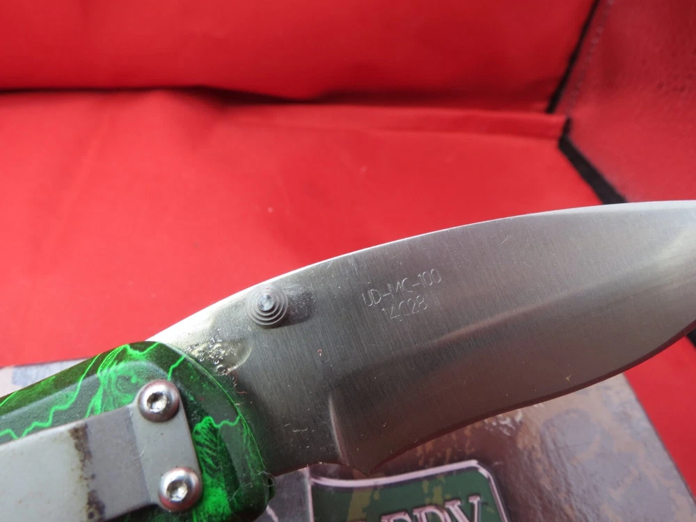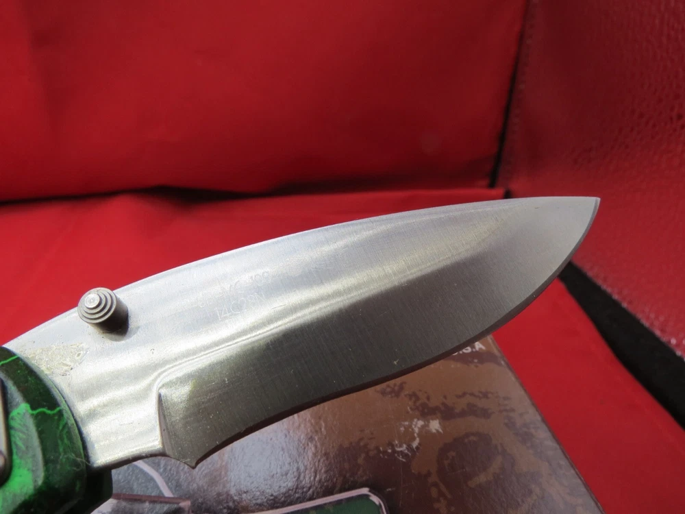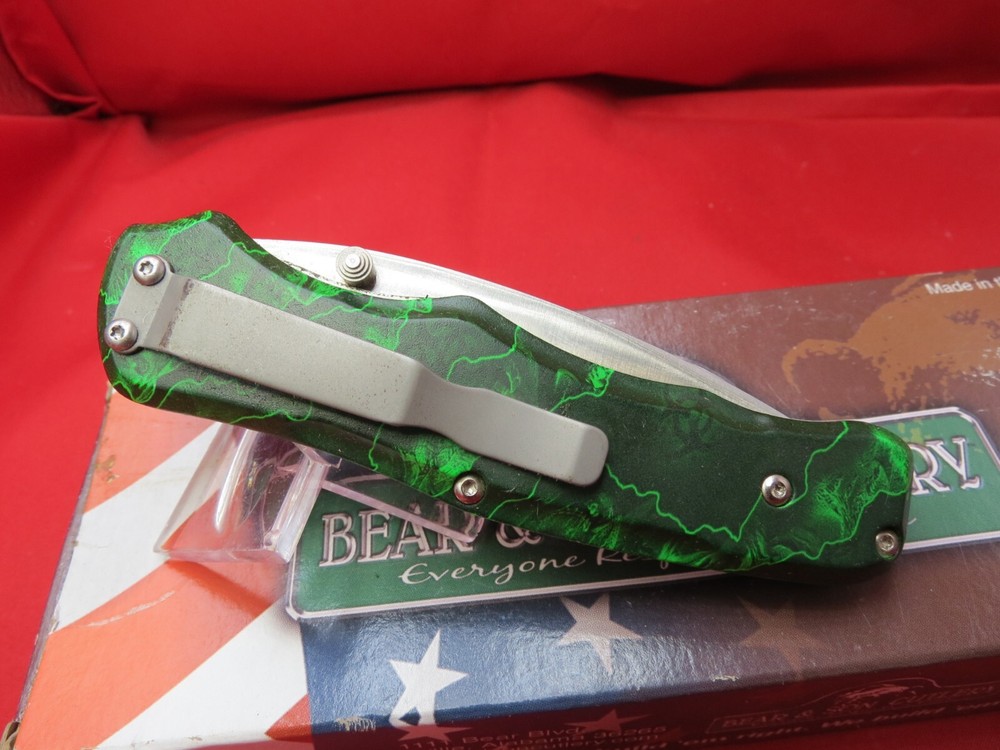 Bear OPS Rancor UNDEAD MC-100 Reaper Z Liner Lock Knife (3.5" Satin The Bear OPS Rancor UNDEAD MC-100 Reaper Z Liner Lock Knife is a high-quality pocketknife designed with a durable Drop Point blade and a manual opening mechanism. Made in the USA by BEAR OPS, this knife boasts a unique green color and features a single blade with a satin finish. The Liner lock ensures secure blade deployment and safe use during cutting tasks. The sleek design and sturdy construction make this knife a modern folding tool that is both functional and collectible for knife enthusiasts. Overall Length: 7.75" Blade Length: 3.25" Cutting Edge: 3.875" Blade Thickness: 0.11" Blade Material: Sandvik 14C28N Blade Style: Drop Point Blade Grind: Flat Finish: Satin Edge Type: Plain Handle Length: 4.50" Handle Thickness: 0.54" WE KNOW YOU HAVE A CHOICE WHERE YOU SHOP… THANKS FOR SHOPPING WITH US AT NO PRESSURE SALES,LLC PLEASE BE SURE AND VISIT OUR OTHER ITEMS Thanks for looking YOU WILL RECEIVE THE ITEM PICTURED UNLESS IT IS A MULTIPLE LISTING OR OTHERWISE STATED.ALL BONE KNIVES COME FROM BOVINE (COW) BONE UNLESS OTHERWISE STATED !!