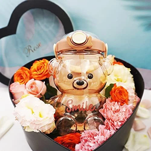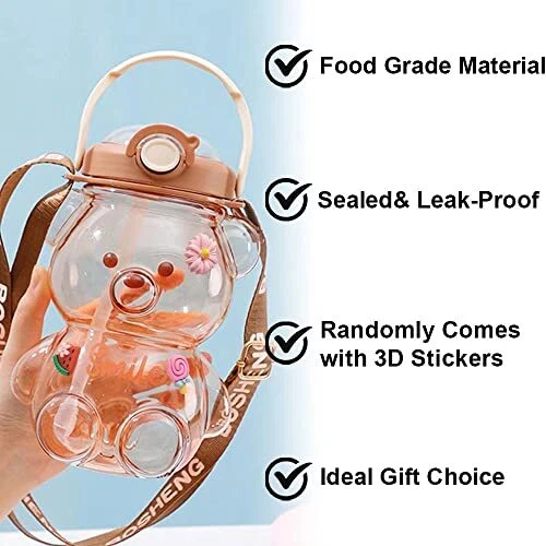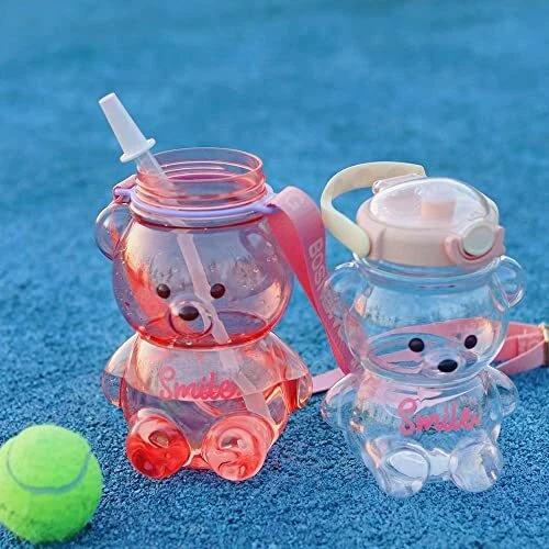 CUTE WATER BOTTLES- Cute bear shape design, feels comfortable, fashionable, and beautiful, randomly attached charms make each water bottle a different, personality. Kawaii bear water bottle, so you can attract attention on any occasion FOOD GRADE MATERIAL- Bear straw bottle made of quality food grade eco-friendly co-polyester plastic, lightweight, 100% BPA FREE reusable, healthy for your daily water drinking ONE-CLICK POP- Easy to open and close the lid with just one hand. Straws allow you to enjoy a spill-proof sip while working or trying. Plastic water bottles with a safety lock to avoid accidental touch to open MULTIPLE SELECTION NEEDS- 4 colors, 2 sizes. Large capacity to meet your different daily drinking needs. Use adjustable straps or handles for easy hydration during travel and make your trip more convenient IDEAL GIFT CHOICE- The bear cup is the ideal gift for family, friends, and yourself to stay hydrated and healthy