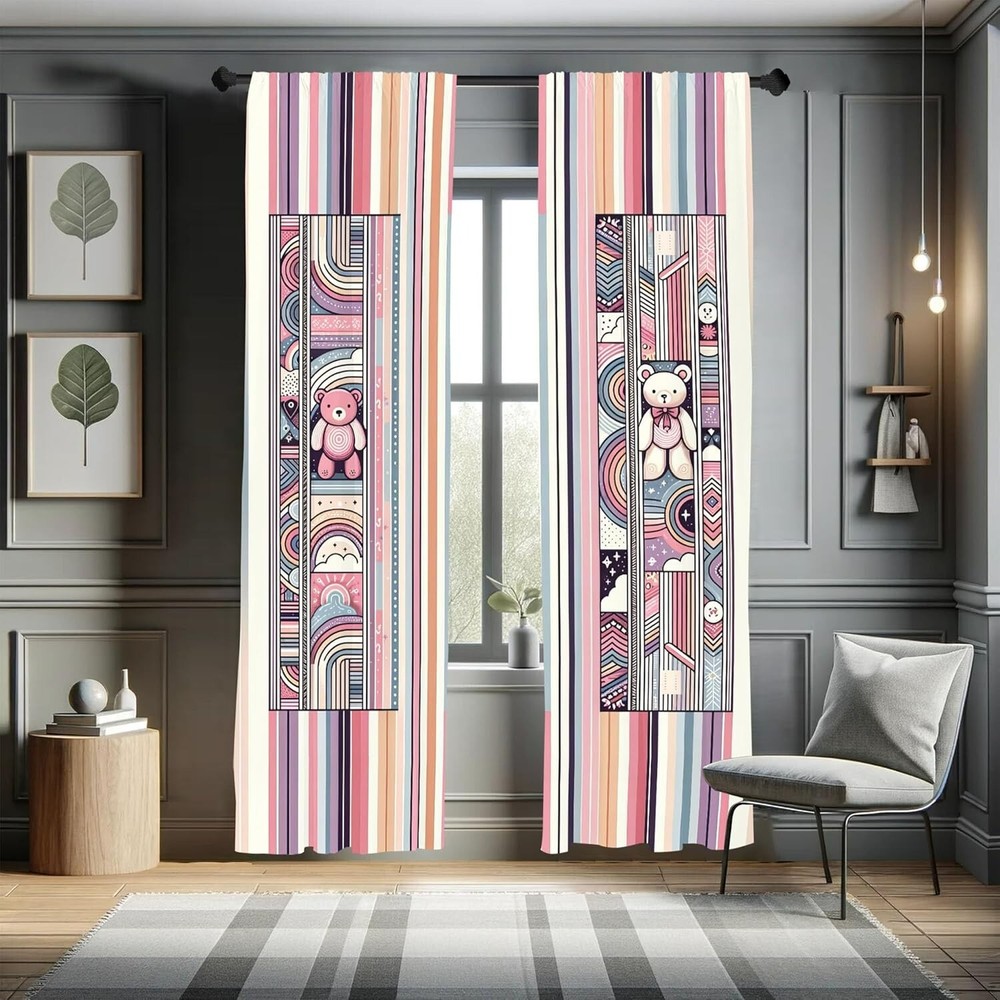 Bear Window Curtains Pack of 2, Delicate Pastel Tone Road Stripes with Modern Cartoon Dream Cloud and Sun, Lightweight Set & Rod Pocket, 4 Panels of - 28" x 84", Blush Blue Grey Ginger 4 Panel Set - Each Panel measures 28" Wide x 84" Long. Lightweight window drapes for bedroom, living room and home decor. MADE FROM - %100 brushed soft microfiber fabric. Lightweight room darkening, modern window coverage. FEATURES - inch rod pocket. For living room, bedroom, dining room & patio door decor. Versatile. MACHINE WASHABLE - On cold delicate cycle, tumble dry on low. Allows your privacy with ease & style. PRINTED - With state of the art digital printing technology. Long lasting bold colors & clear image.
