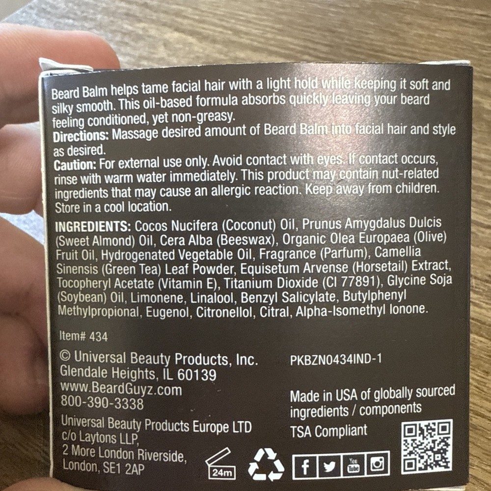 Country/Region of Manufacture: United States Department: Adult, Men Size: Standard Size UPC: 0746817004151 Hair Type: Beard Model: Coarse Features: Cruelty-Free/No Animal Testing Period After Opening (PAO): 24M Product Line: Beard Guyz Grotein Active Ingredients: Shea Butter, Black Castor Seed Oil, Soybean Oil Styling Effect: Deep Conditioning, Moisturizing, Softening Ingredients: Coconut Oil, Shea Butter, Beeswax Type: Beard Balm gtin13: 0746817004151 Brand: Beard Guyz Volume: 3 fl oz Formulation: Oil MPN: Not specified
